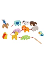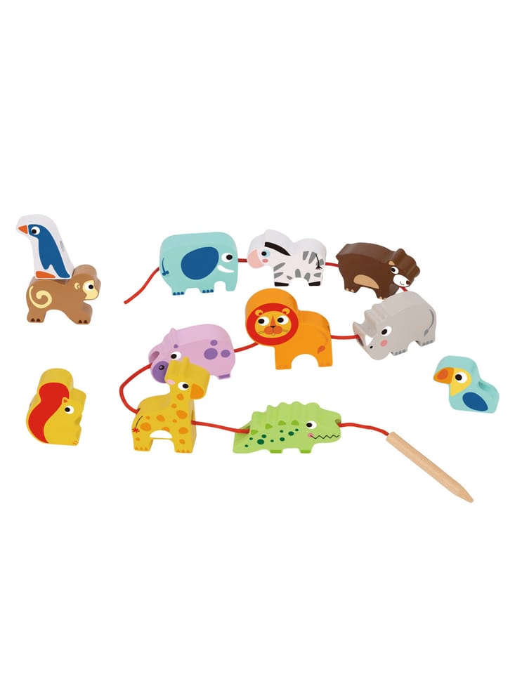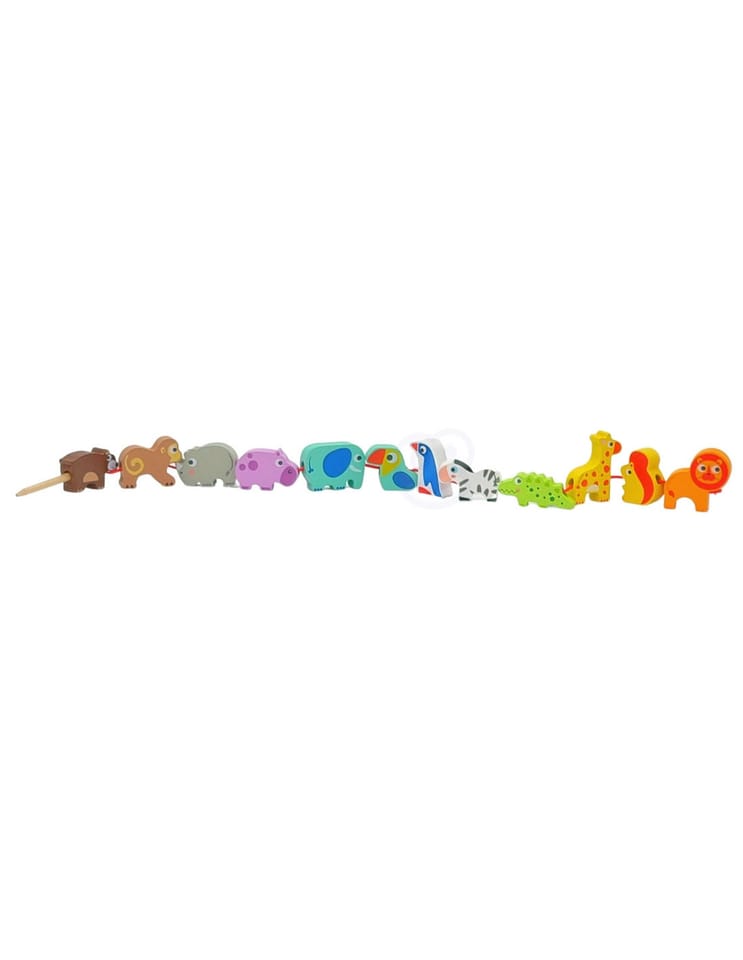 - - W zestawie: 12 drewnianych koralików z motywami safari (np. lew, żyrafa, małpka) + sznureczek