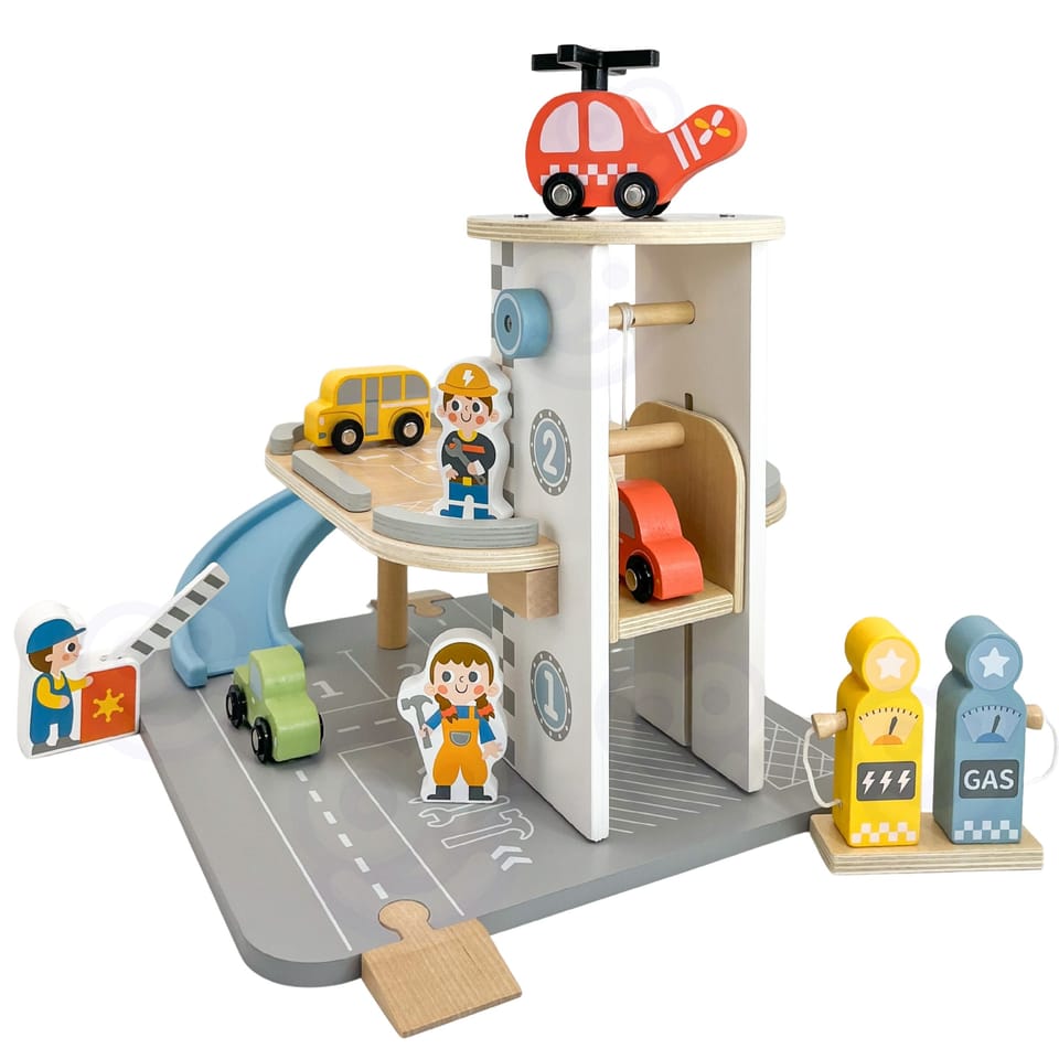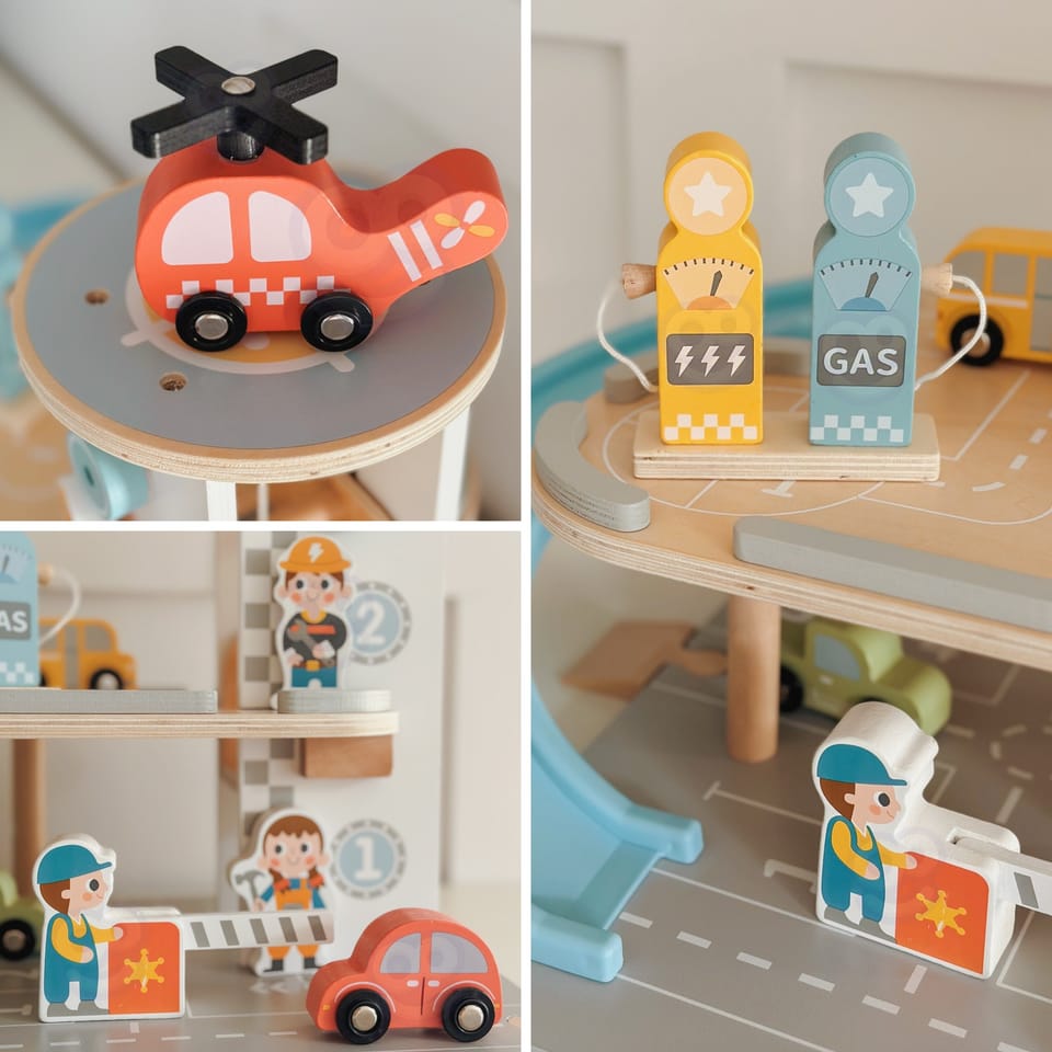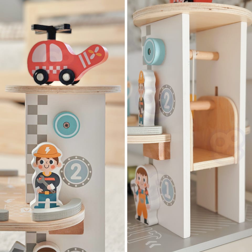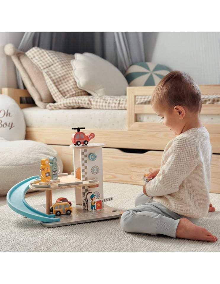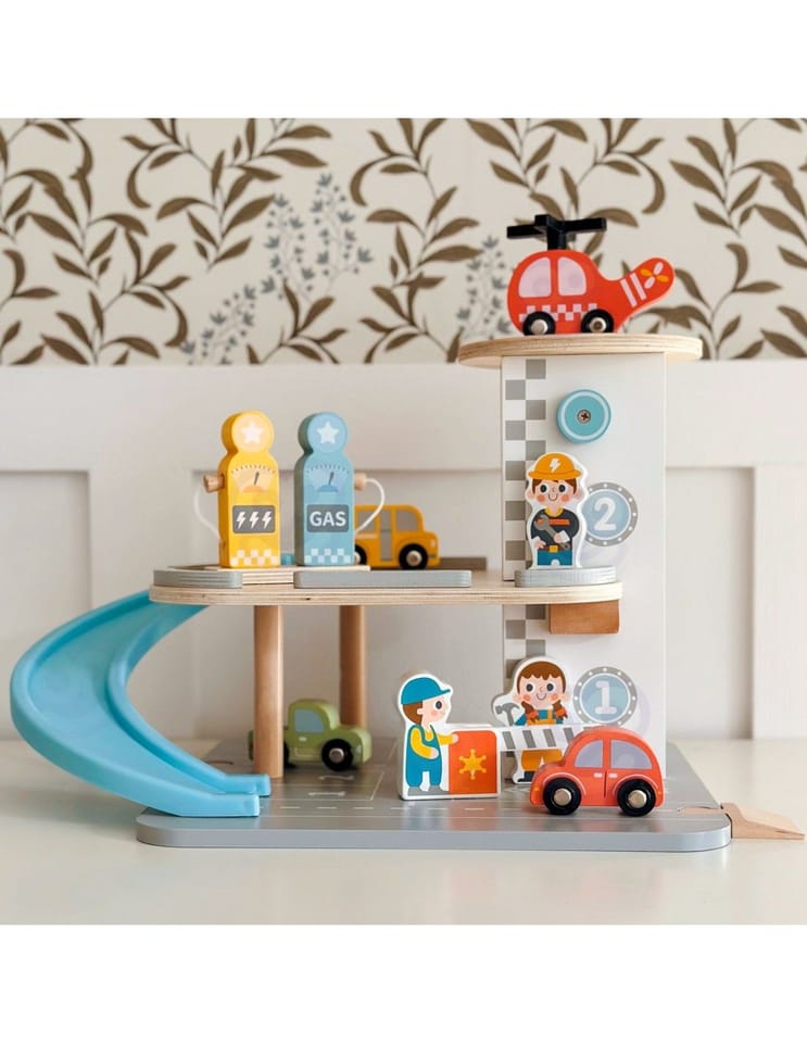 Wielopoziomowy drewniany parking marki Woopie Green to marzenie każdego małego miłośnika samochodów. Ta wyjątkowa zabawka oferuje mnóstwo możliwości kreatywnej zabawy. Kolorowe drewniane samochody zjeżdżają po niebieskiej zjeżdżalni, helikopter z obrotowym śmigłem ląduje na szczycie wieży, a figurki pracowników dbają o porządek i obsługują stację benzynową. Solidna drewniana konstrukcja w subtelnych, pastelowych kolorach świetnie wygląda w pokoju dziecka