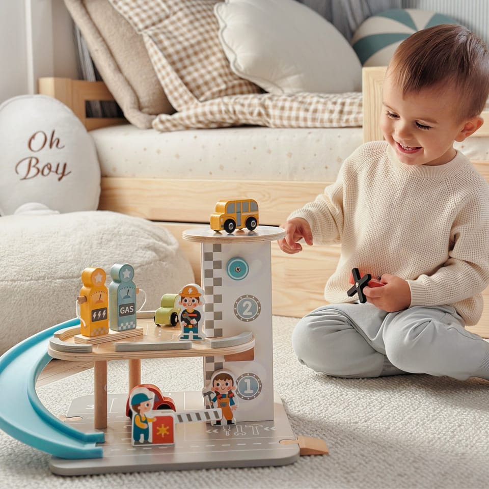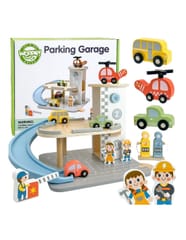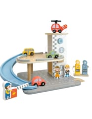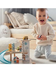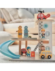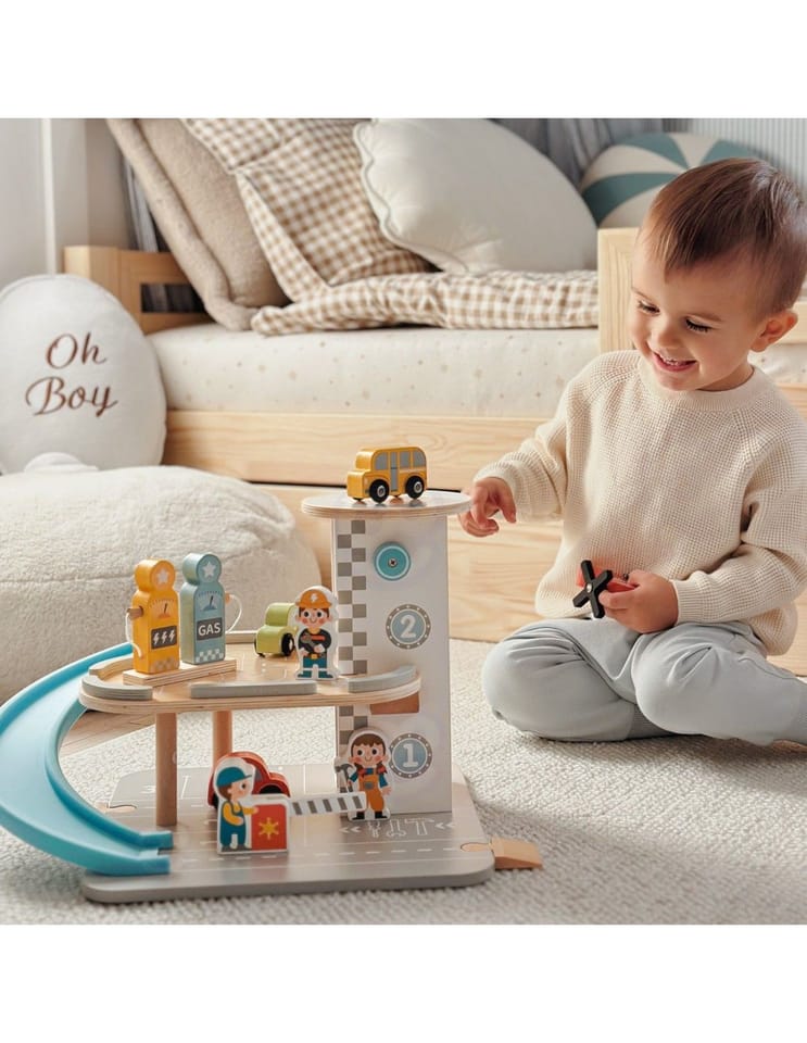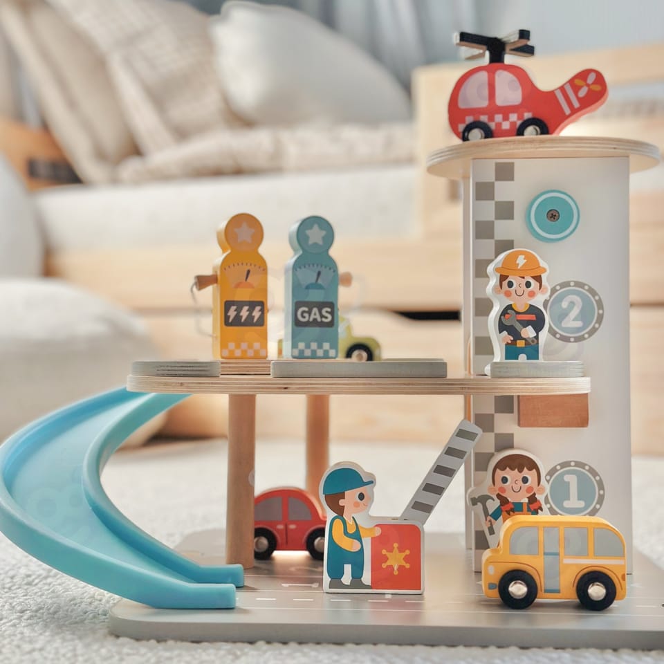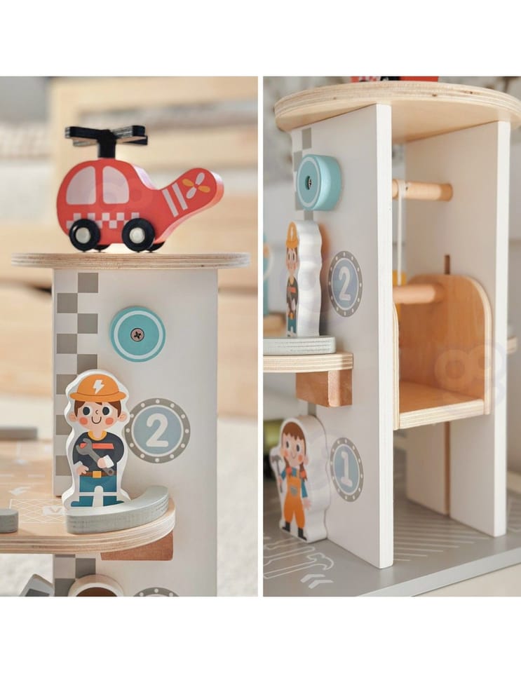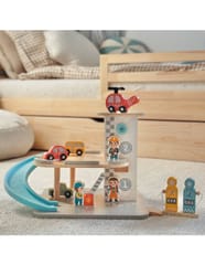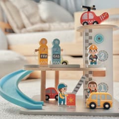 Wielopoziomowy drewniany parking marki Woopie Green to marzenie każdego małego miłośnika samochodów. Ta wyjątkowa zabawka oferuje mnóstwo możliwości kreatywnej zabawy. Kolorowe drewniane samochody zjeżdżają po niebieskiej zjeżdżalni, helikopter z obrotowym śmigłem ląduje na szczycie wieży, a figurki pracowników dbają o porządek i obsługują stację benzynową. Solidna drewniana konstrukcja w subtelnych, pastelowych kolorach świetnie wygląda w pokoju dziecka
