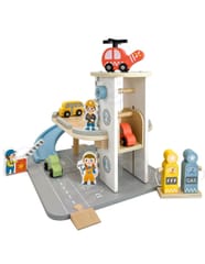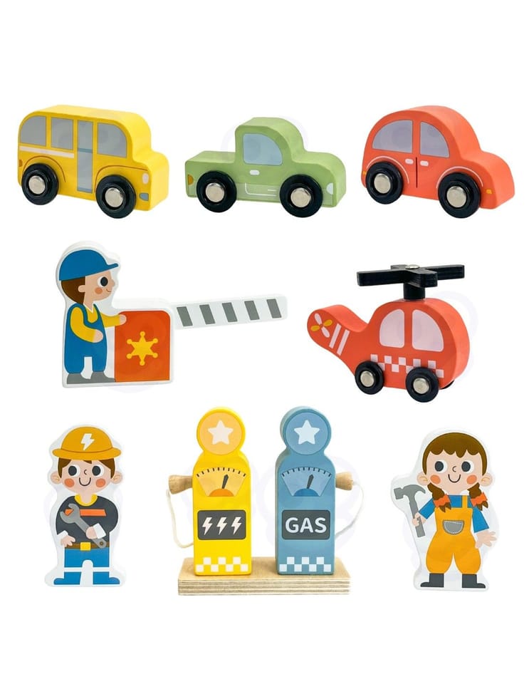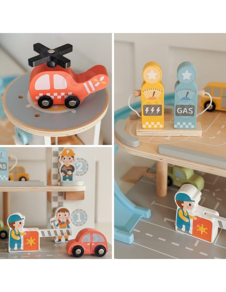 - - Motorykę - Precyzyjne manewrowanie małymi drewnianymi pojazdami po rampach, zjeżdżalniach i miejscach parkingowych doskonali koordynację ręka-oko oraz zręczność palców. Ustawianie figurek, manipulowanie elementami stacji benzynowej i poruszanie helikoptera wymaga kontrolowanych, dokładnych ruchów dłoni.