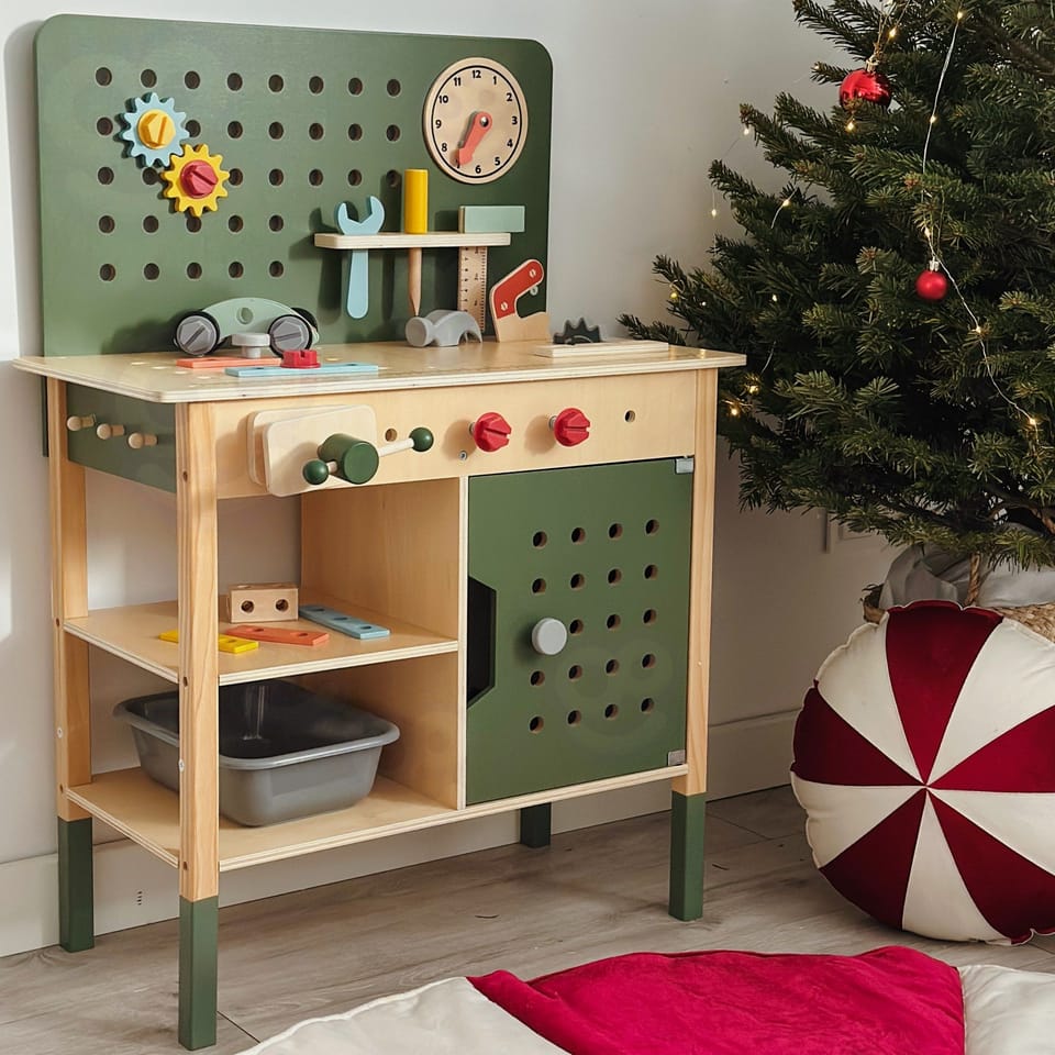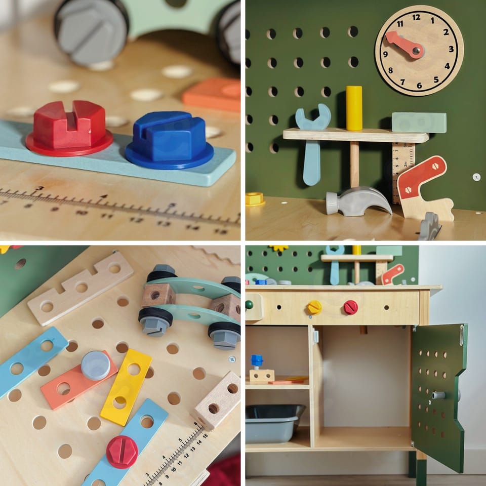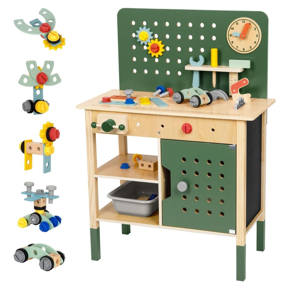 Drewniany warsztat majsterkowicza dla dzieci od Woopie Green to doskonała zabawka edukacyjna, która wprowadza najmłodszych w fascynujący świat konstruowania, napraw i odkrywania zasad działania narzędzi. Zestaw wykonany jest z wysokiej jakości drewna i bezpiecznych materiałów, gwarantując długą i bezpieczną zabawę. Dzięki licznym elementom i realistycznym detalom maluch może poczuć się jak prawdziwy mały inżynier lub konstruktor!Warsztat został wykonany z wysokiej jakości drewna, które jest przyjemne w dotyku, ekologiczne i w pełni bezpieczne dla dzieci. Starannie oszlifowane krawędzie i trwała konstrukcja gwarantują bezpieczeństwo i komfort podczas zabawy. Zabawka zachwyca dbałością o detale – znajdziesz tu prawdziwie wyglądające narzędzia, ruchome elementy, półki na akcesoria, a nawet zegar z obrotowymi wskazówkami i tablicę kredową do notowania pomysłów czy rysowania projektów. Każdy element został zaprojektowany z myślą o wszechstronnym rozwoju dziecka. Dzięki warsztatowi maluch poznaje zasady działania podstawowych narzędzi, rozwija zdolności manualne, uczy się logicznego myślenia i ćwiczy cierpliwość. To doskonały sposób, aby zachęcić dziecko do samodzielności i twórczego myślenia w codziennej zabawie.