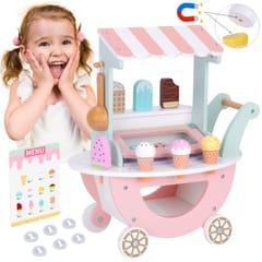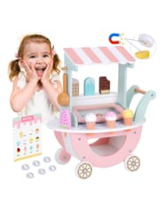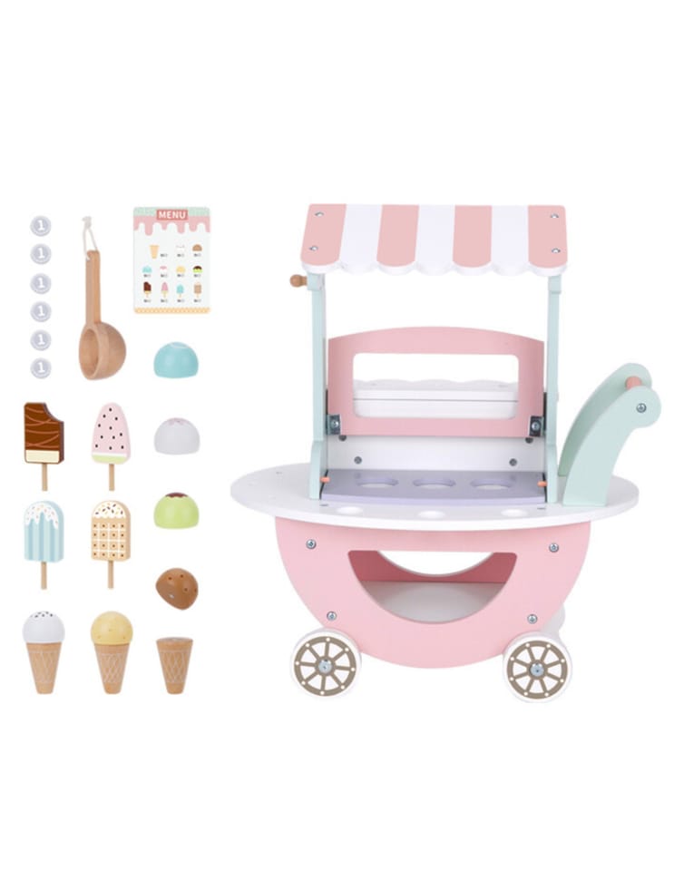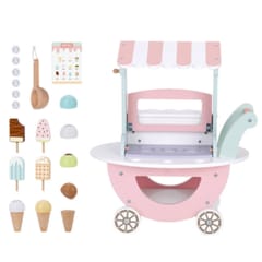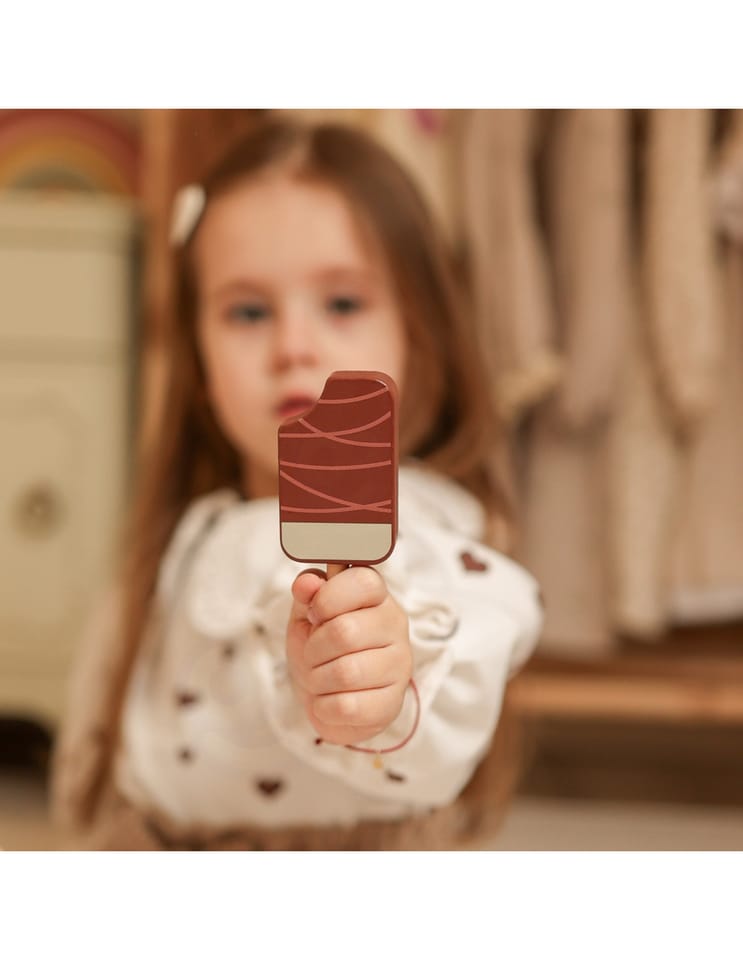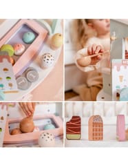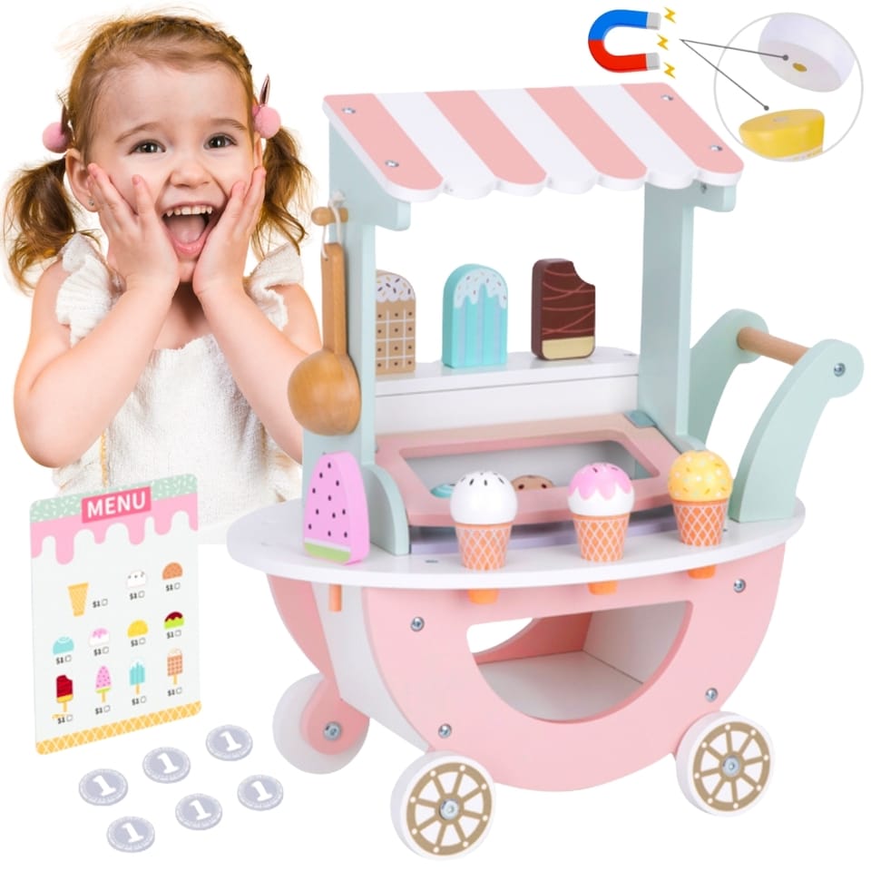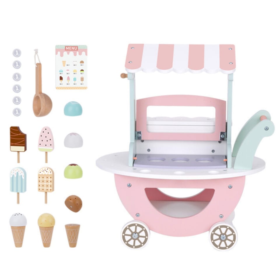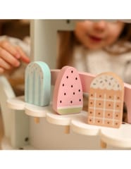 - - Bogaty zestaw akcesoriów: Zawiera lody na patyku, wafelki, kolorowe gałki, łyżkę do lodów, menu oraz drewniane monety – łącznie 27 elementów
