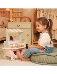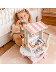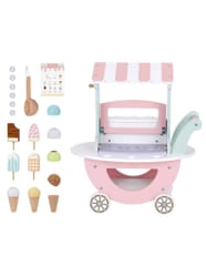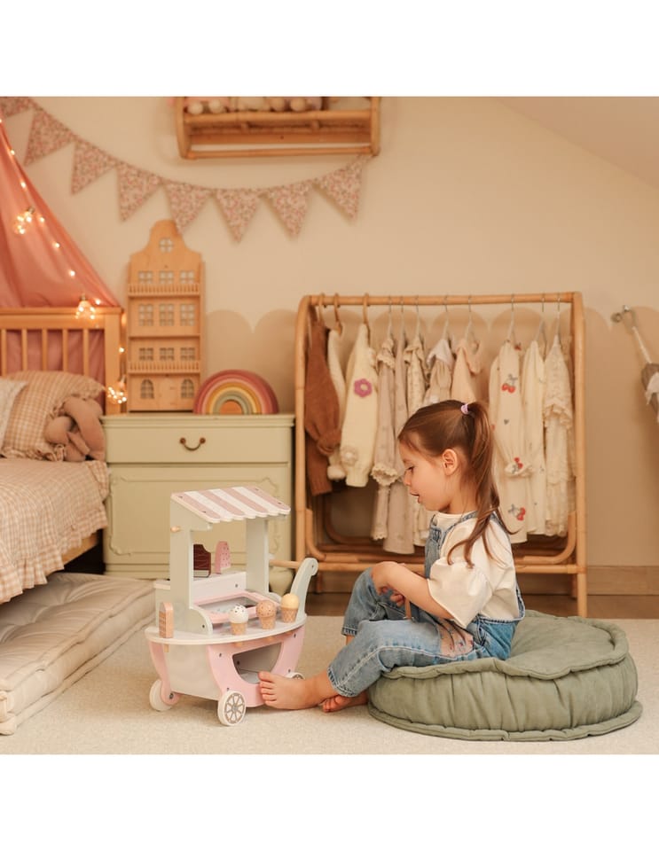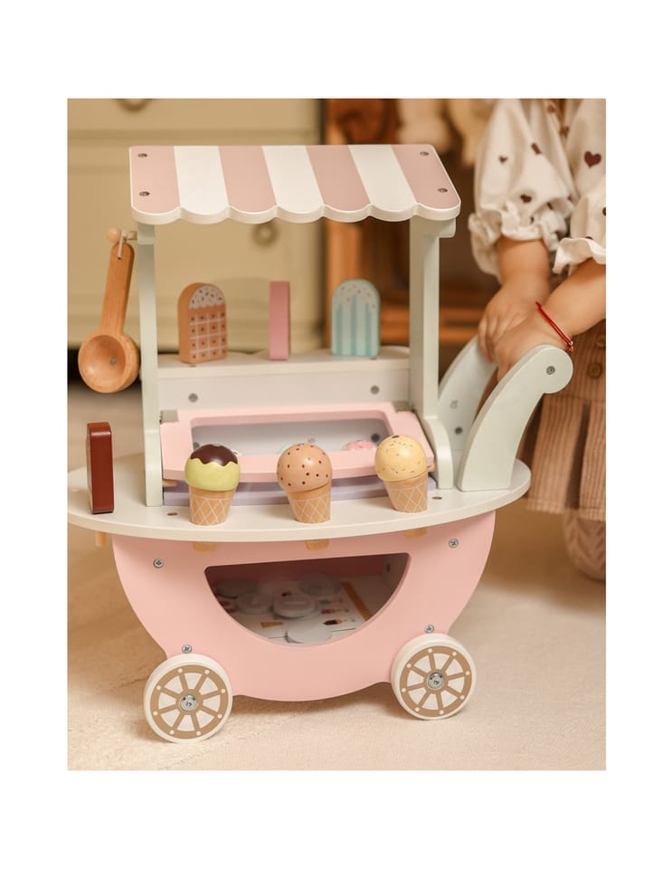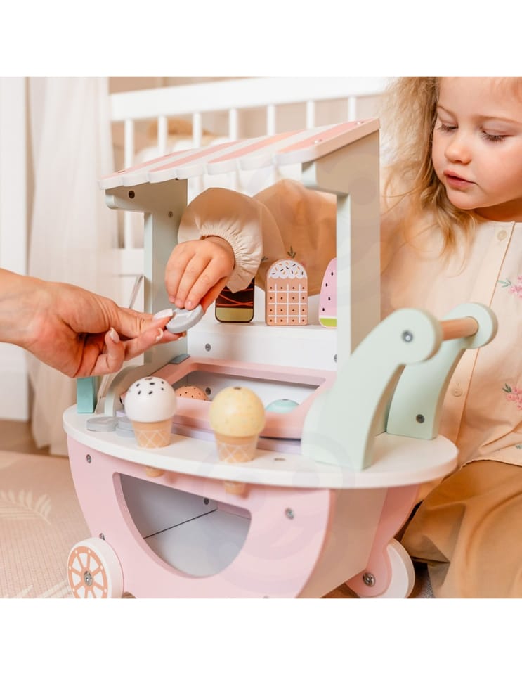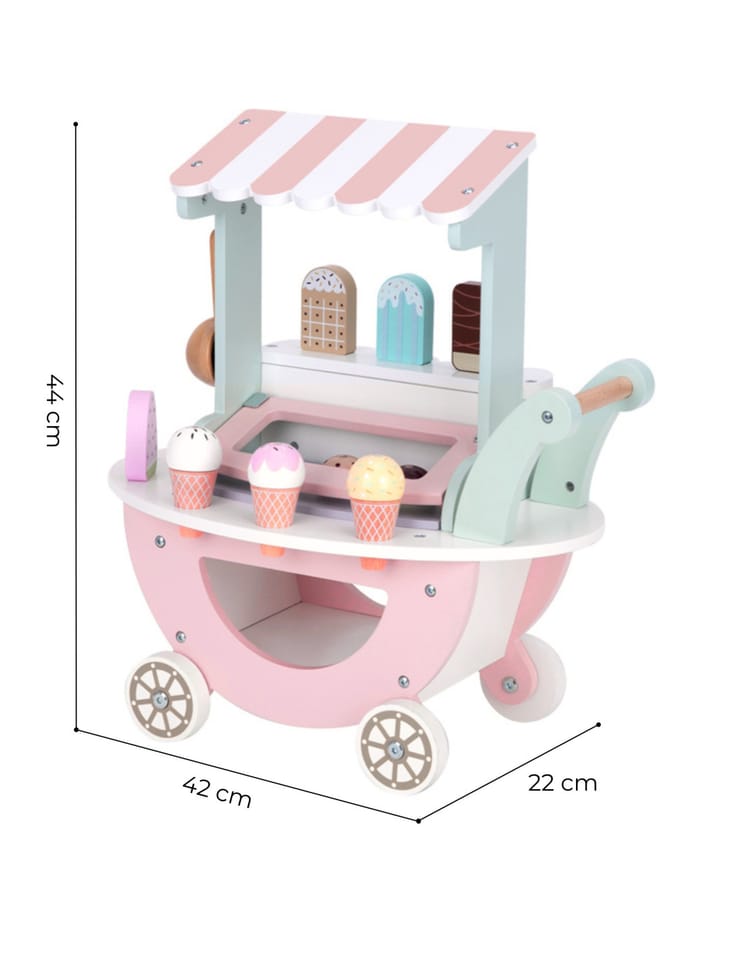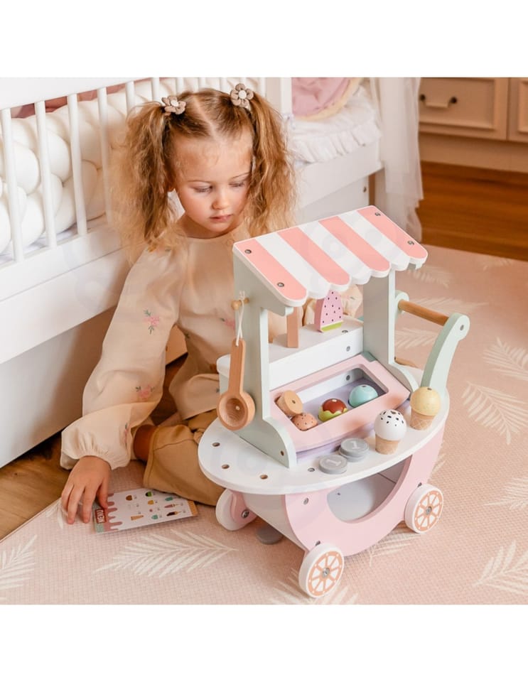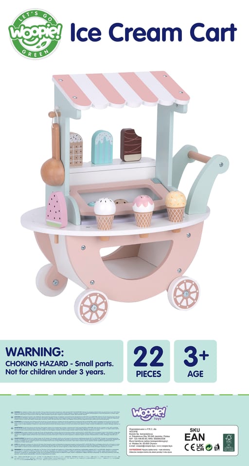 Czy są dzieci, które nie kochają lodów? A teraz wyobraź sobie, że Twoje dziecko może otworzyć własną lodziarnię! Drewniana Lodziarnia od Woopie Green to nie tylko uroczy wózek na kółkach, ale prawdziwe centrum kreatywnej zabawy, która uczy, bawi i rozwija. Zestaw zawiera aż 27 elementów, w tym kolorowe gałki lodów z magnetycznym mocowaniem, patyczki, rożki, łyżkę do lodów i zabawkowe monety. Dzięki różnorodnym akcesoriom dziecko może wcielić się w rolę sprzedawcy, klienta lub lodowego mistrza – tworząc smaki i kombinacje według własnego pomysłu!
