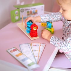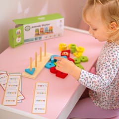 - - "mała motorykę" - manipulowanie klockami, układanie ich na podstawce oraz łączenie zwierzątek wymaga precyzyjnych ruchów dłoni i palców, co wzmacnia umiejętności manualne i koordynację