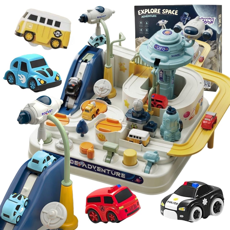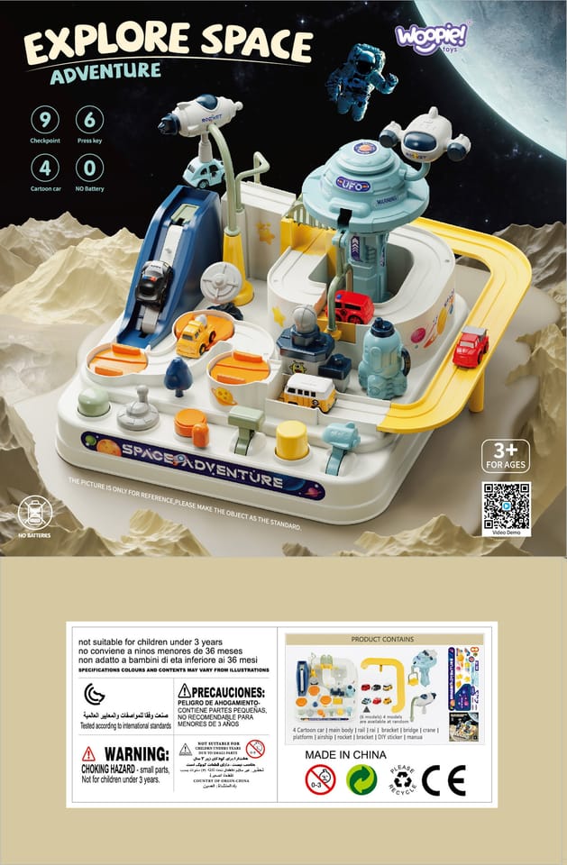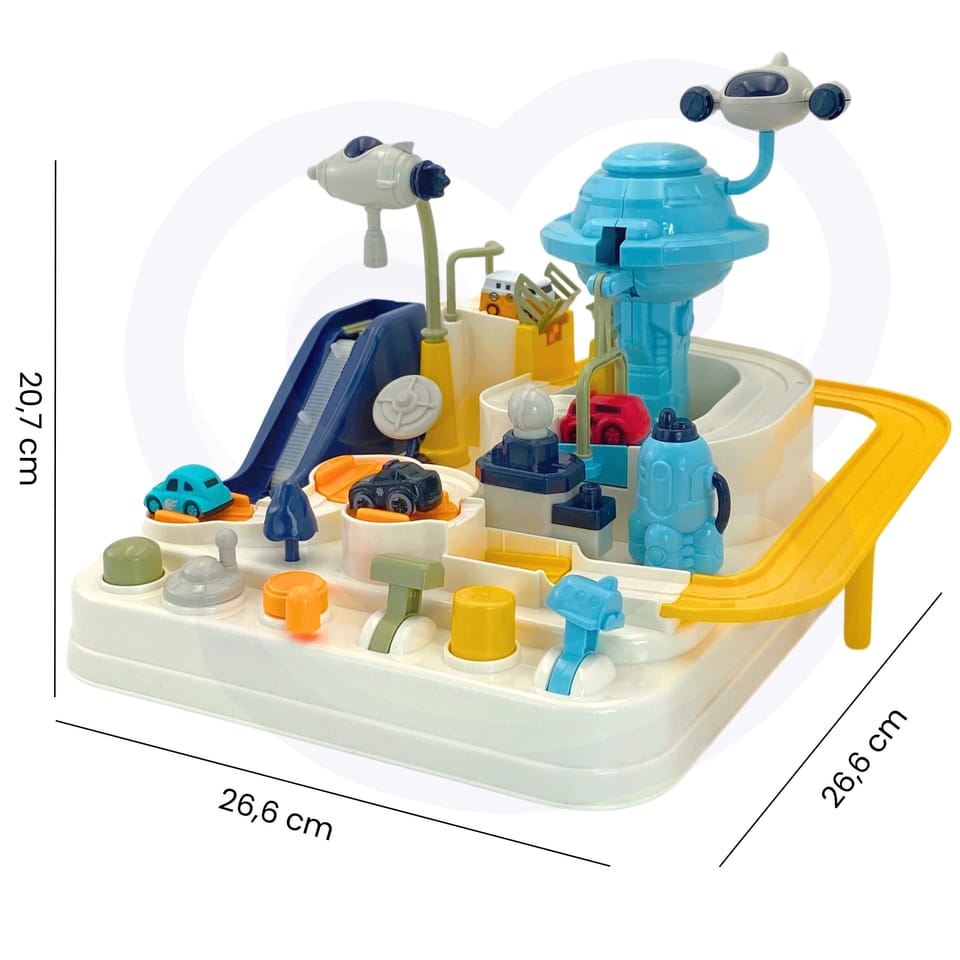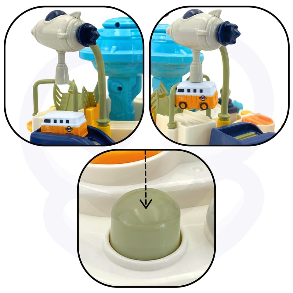 - Zabawka od 3 roku życia- Do zestawu dołączona instrukcja obsługi zabawki - Zaprojektowany na wzór bazy kosmicznej, z elementami takimi jak statki kosmiczne i pojazd UFO- Ruchome elementy - sterujemy nimi używając odpowiednich guzików i obracając odpowiednie pokrętła- Autka przenoszone "w powietrzu" dzięki magnesowi - Dzieci muszą planować swoje działania i podejmować decyzje, jak pokonać różne przeszkody na trasie- Aby tor działał, nie potrzebne są baterie