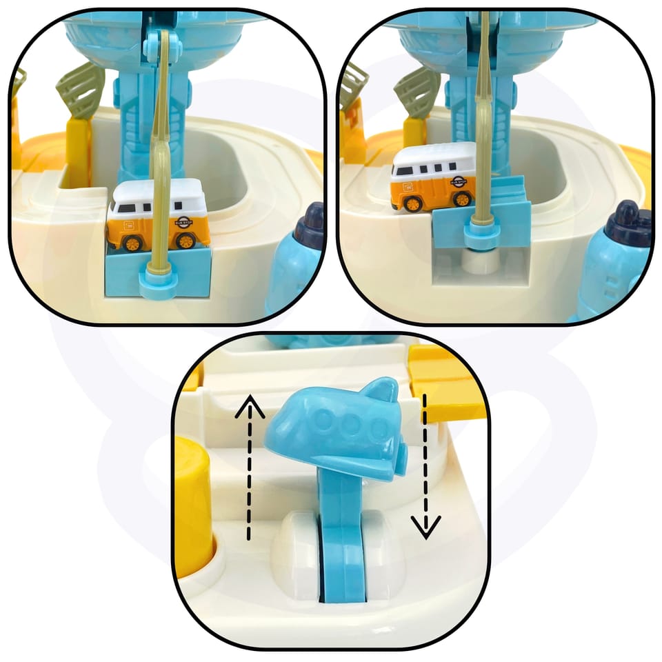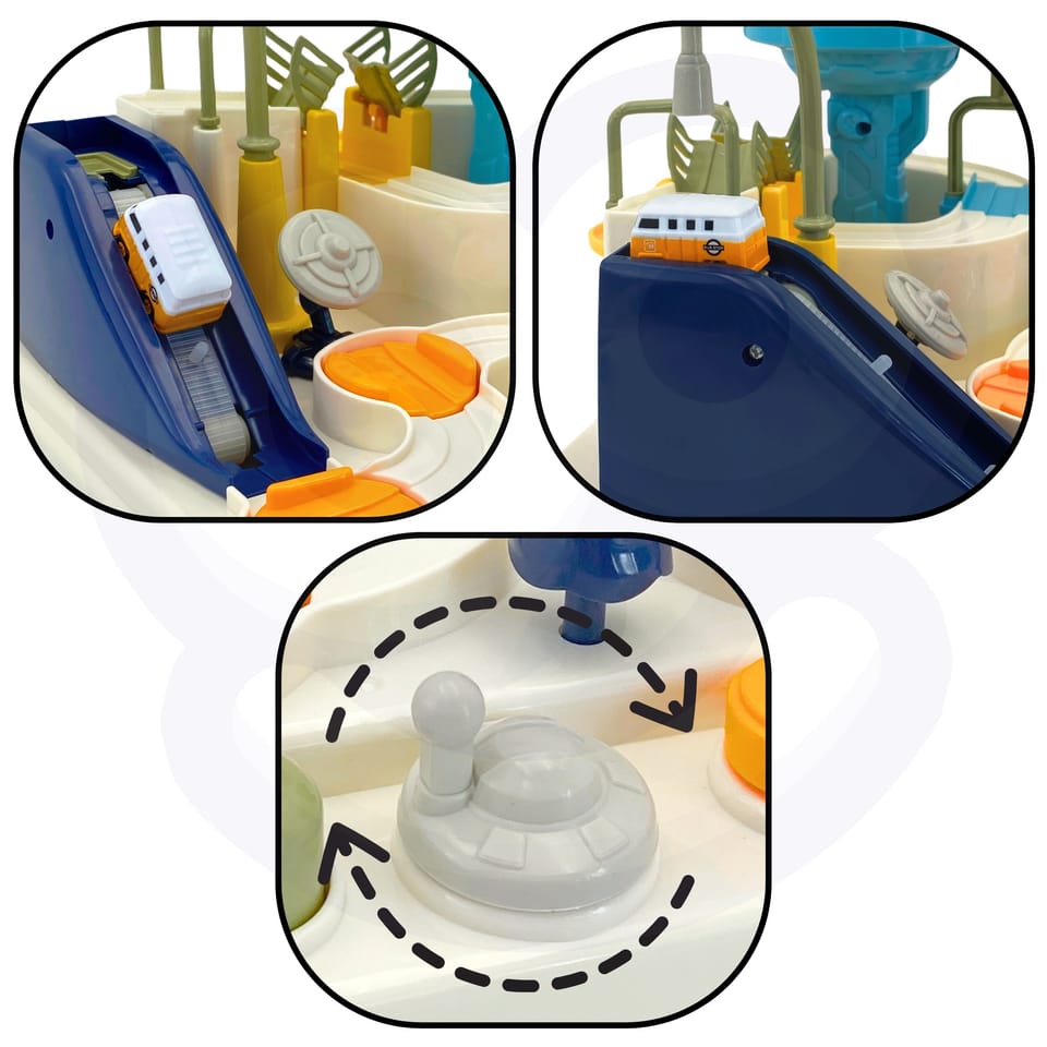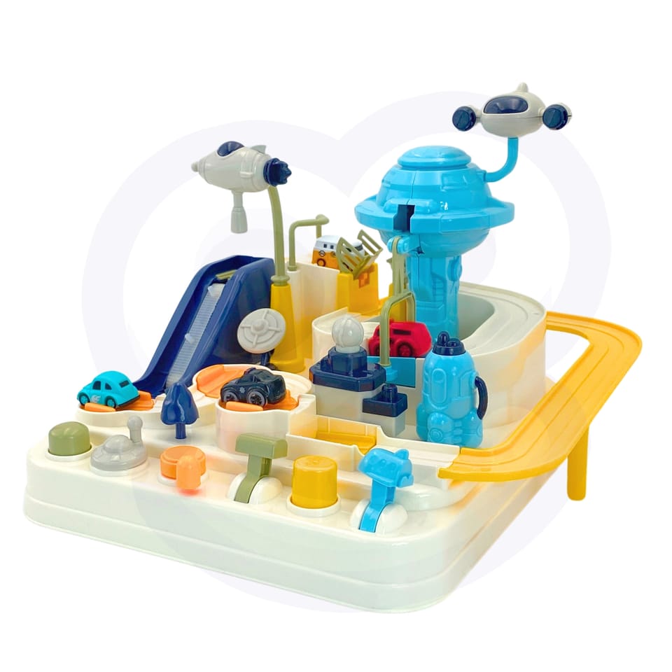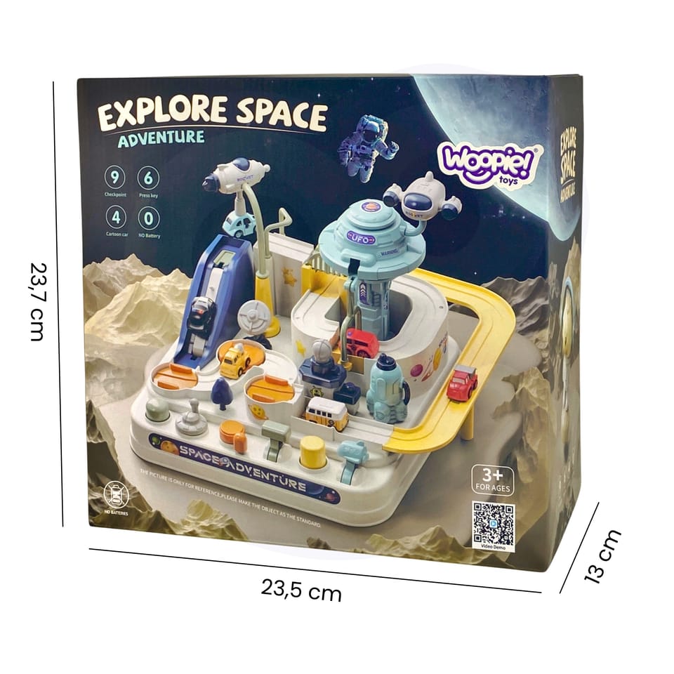 - Zabawka od 3 roku życia- Do zestawu dołączona instrukcja obsługi zabawki - Zaprojektowany na wzór bazy kosmicznej, z elementami takimi jak statki kosmiczne i pojazd UFO- Ruchome elementy - sterujemy nimi używając odpowiednich guzików i obracając odpowiednie pokrętła- Autka przenoszone "w powietrzu" dzięki magnesowi - Dzieci muszą planować swoje działania i podejmować decyzje, jak pokonać różne przeszkody na trasie- Aby tor działał, nie potrzebne są baterie