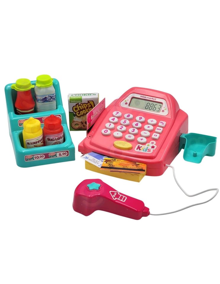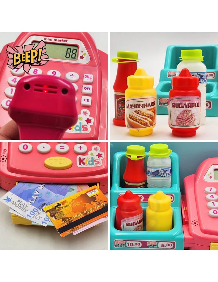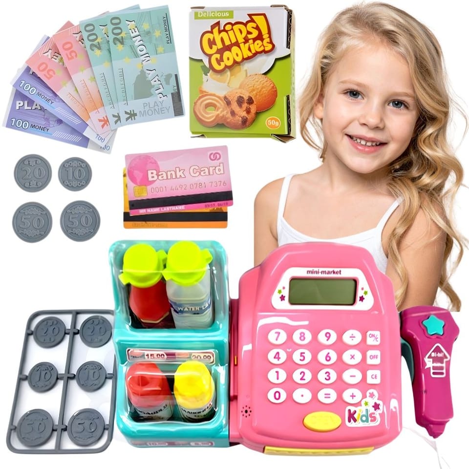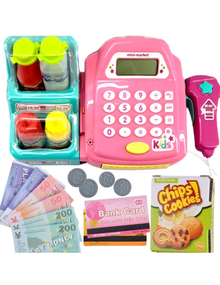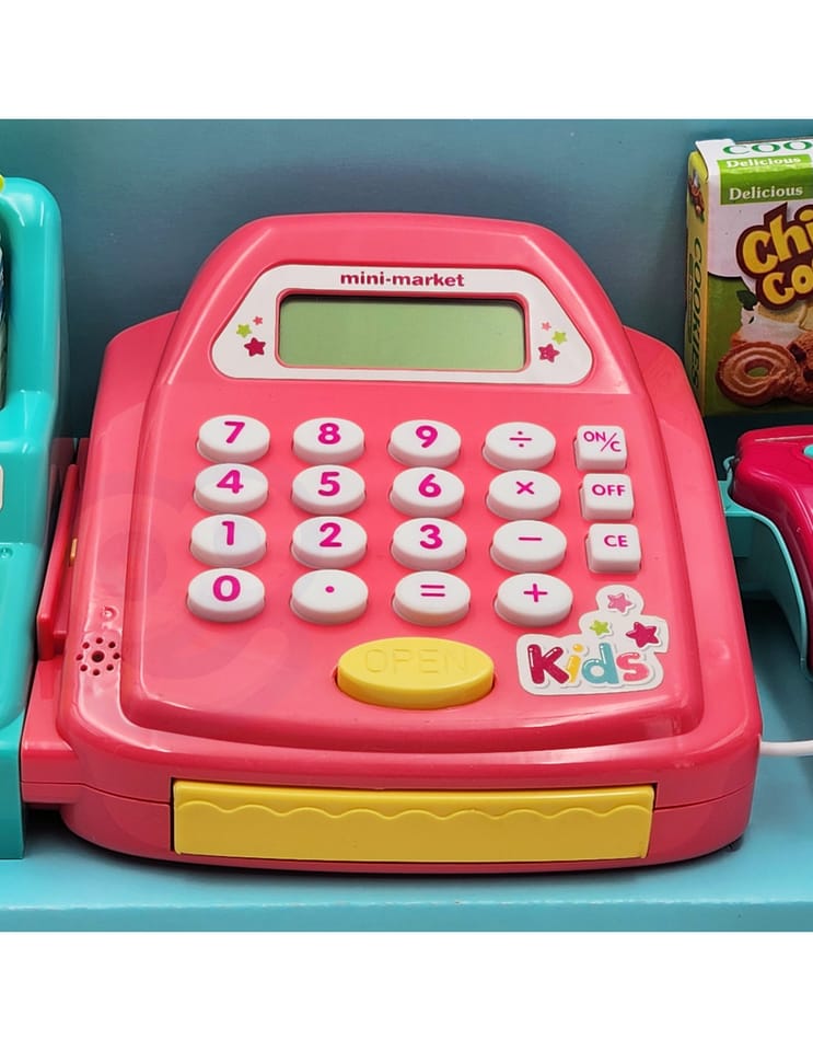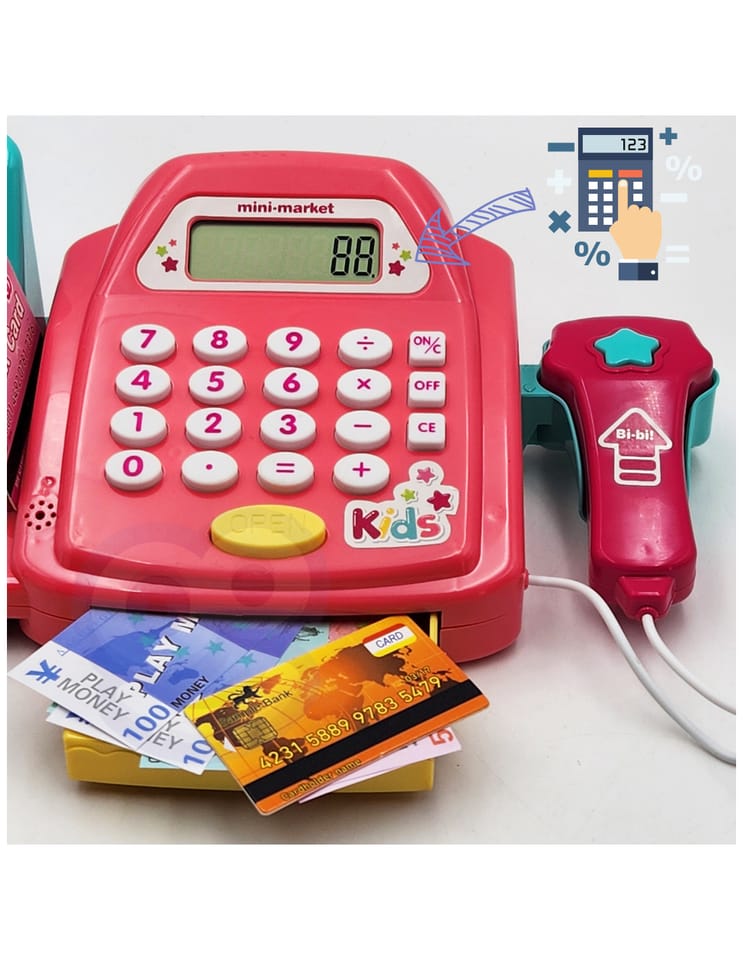 - - kasę sklepową z kalkulatorem i otwieraną kasetka na przechowywanie pieniążków