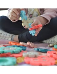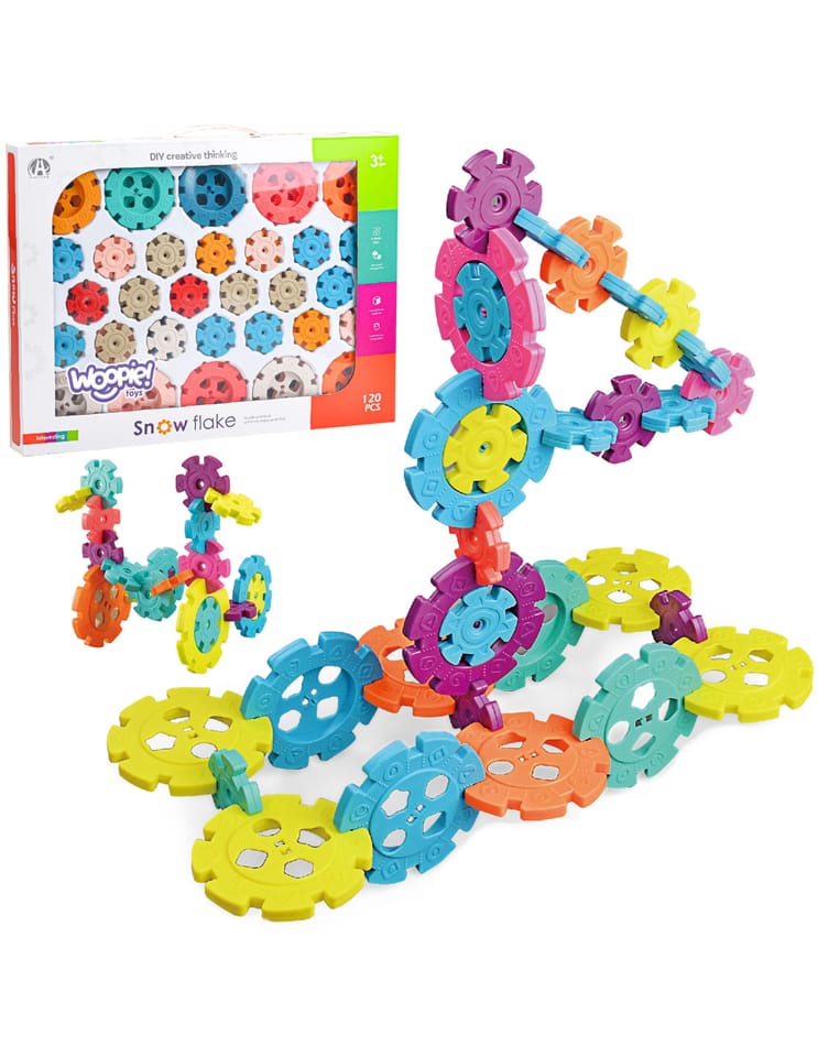 Klocki Konstrukcyjne Wafle od marki WOOPIE zwrócą uwagę i zafascynują Twoje dziecko. Kolorowe elementy przypominają wyglądem płatki śniegu. Klocki w bardzo łatwy sposób łączą się ze sobą, a ze względu na swoją budowę i sposób łączenia można z nich tworzyć ciekawe trójwymiarowe konstrukcje. Zastosowane otwory w śnieżynkach pozwalają na łączenie ich pod skosem, a nie tylko prostopadle. Zestaw zawiera 120 elementów: w tym 40 dużych i 80 małych klocków. Samo budowanie konstrukcji rozwinie u dziecka logiczne myślenie, wyobraźnie, kreatywność oraz pomoże mu się skoncentrować podczas tworzenia. Przez układanie klocków dziecko poznaje kształty i kolory oraz ćwiczy zdolności manualne tzw. motorykę małą.