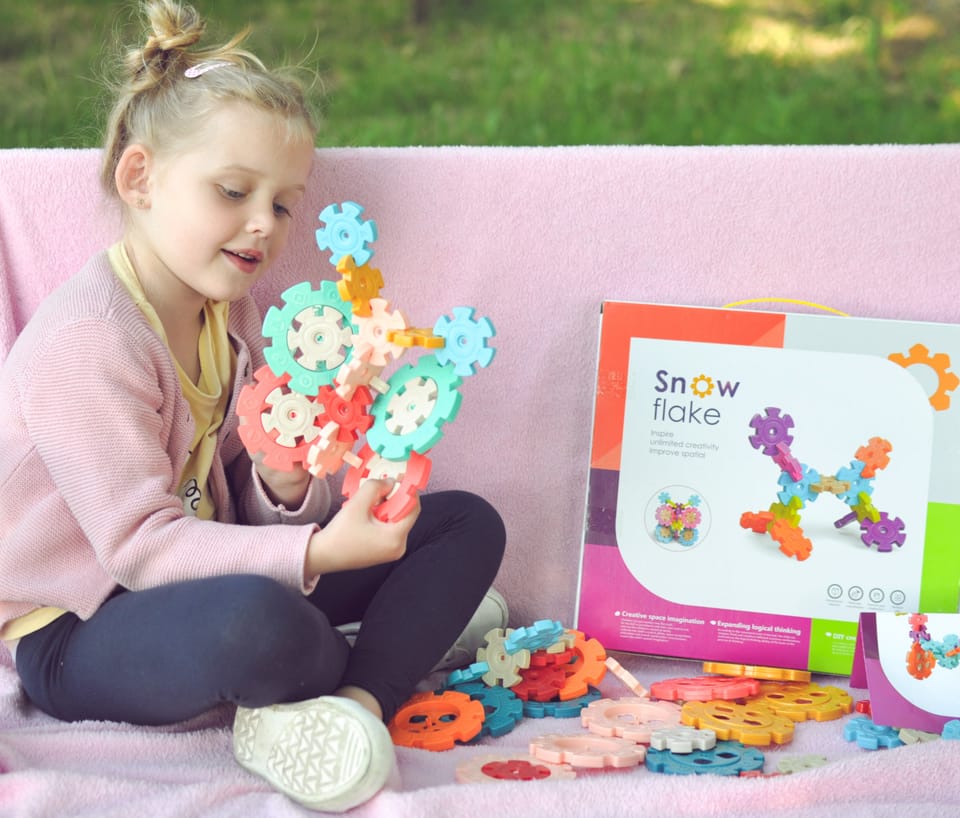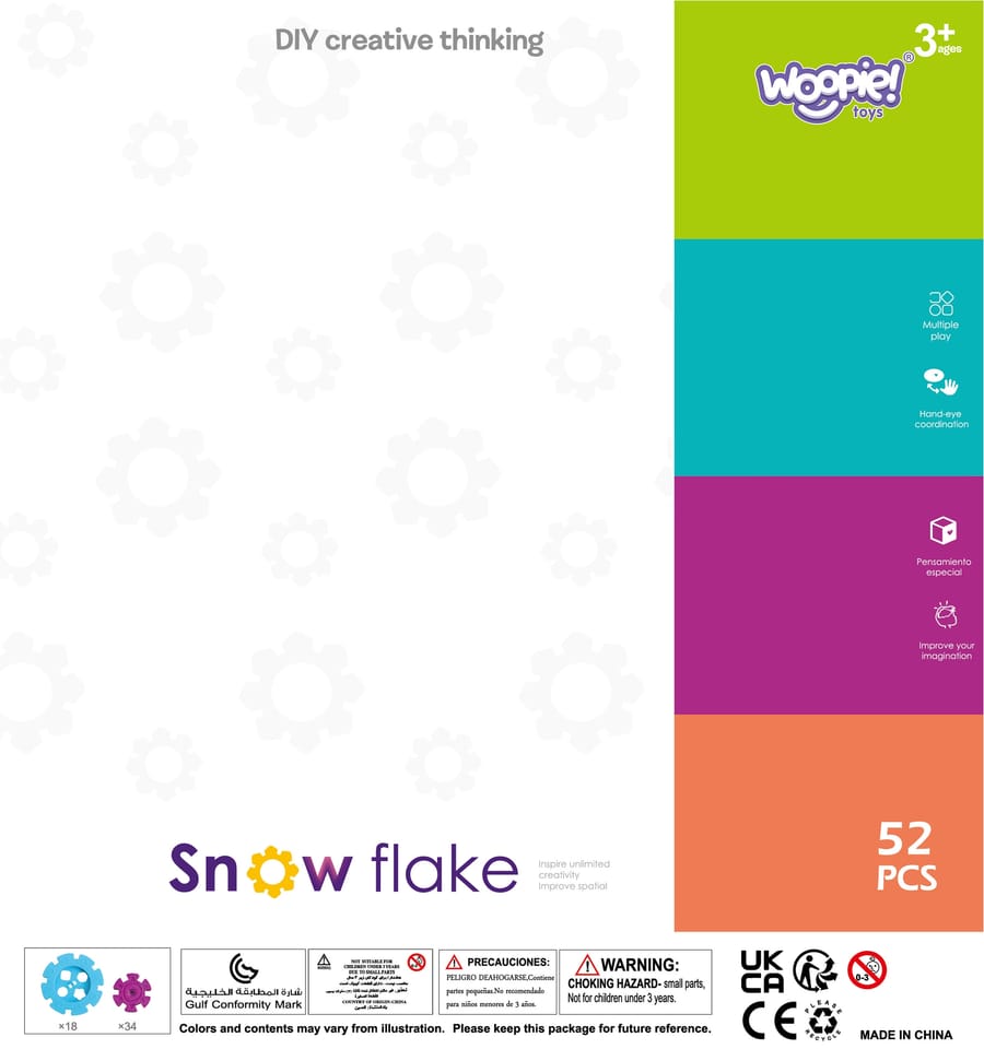 Klocki Konstrukcyjne Wafle od marki WOOPIE zwrócą uwagę i zafascynują Twoje dziecko. Kolorowe elementy przypominają wyglądem płatki śniegu. Klocki w bardzo łatwy sposób łączą się ze sobą, a ze względu na swoją budowę i sposób łączenia można z nich tworzyć ciekawe trójwymiarowe konstrukcje. Zastosowane otwory w śnieżynkach pozwalają na łączenie ich pod skosem, a nie tylko prostopadle. Zestaw zawiera 52 elementy: w tym 18 dużych i 34 małych klocków. Samo budowanie konstrukcji rozwinie u dziecka logiczne myślenie, wyobraźnie, kreatywność oraz pomoże skoncentrować się podczas tworzenia. Przez układanie klocków dziecko poznaje kształty i kolory oraz ćwiczy zdolności manualne tzw. motorykę małą.