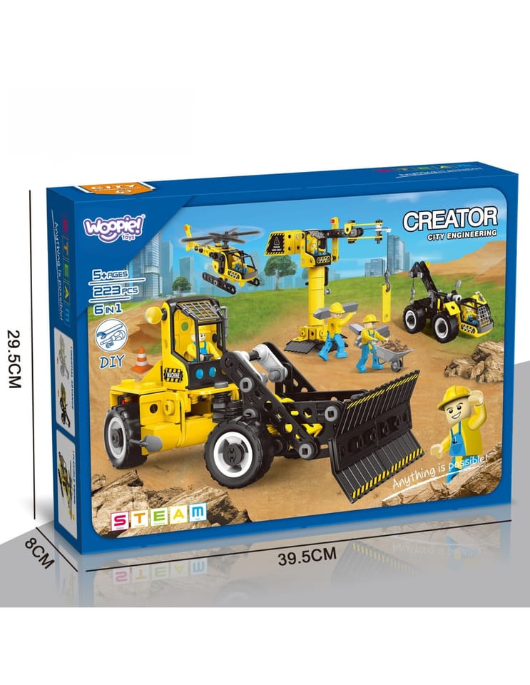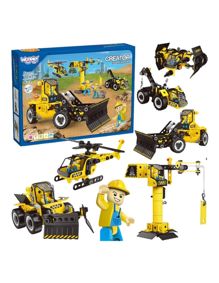 Zbuduj własne pojazdy i maszyny policyjne z serii CREATOR City Police Force! od marki Woopie Ten zestaw konstrukcyjny typu DIY to idealna propozycja dla małych inżynierów i pasjonatów budowania. Dzięki elementom STEAM dziecko rozwija kreatywność, logiczne myślenie oraz zdolności manualne. Z jednego kompletu można stworzyć aż 6 różnych modeli – od helikoptera po pojazdy terenowe z chwytakiem. To nie tylko zabawa, ale także świetna nauka i wprowadzenie w świat techniki.