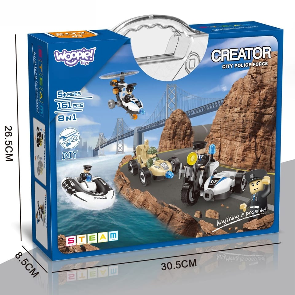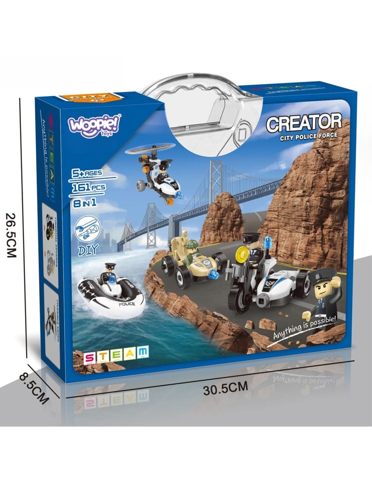 Zestaw klocków Creator City Police Force od marki Woopie pozwoli mu wcielić się w rolę odważnego policjanta i samodzielnie budować różne pojazdy – motocykle, auta terenowe, łodzie i quady. To świetna zabawa, która rozwija kreatywność, uczy logicznego myślenia i daje wiele godzin frajdy. Zestaw jest idealny dla fanów konstrukcji i policji, a przy tym świetnie sprawdzi się jako prezent. Wygodne pudełko z rączką pozwala zabrać zestaw wszędzie ze sobą!