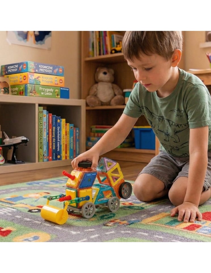 Odkryj świat kreatywnej zabawy z innowacyjnym zestawem klocków magnetycznych 3D od marki Woopie! Ten 80-elementowy zestaw to fantastyczny sposób na rozwijanie wyobraźni i umiejętności inżynierskich u Twojego dziecka. Klocki magnetyczne pozwalają na tworzenie trójwymiarowych konstrukcji, w tym realistycznych pojazdów budowlanych, takich jak wywrotka, spychacz/ładowarka, a także robotów. Żywe kolory i różnorodne kształty geometryczne (kwadraty, trójkąty, trapezy) w połączeniu z elementami pojazdów (koła, podwozia, elementy łyżki/wywrotki) zapewniają nieograniczone możliwości budowania i przekształcania. Magnetyczne łączenia sprawiają, że konstrukcje są stabilne i łatwe w montażu, co jest idealne dla małych rączek. To edukacyjna zabawka STEM (Science, Technology, Engineering, Mathematics), która inspiruje do nauki poprzez zabawę. Zabawa klockami magnetycznymi wspiera rozwój zdolności motorycznych i uczy podstaw geometrii oraz fizyki, prezentując zjawisko magnetyzmu w praktyczny sposób. Duża liczba elementów, w tym specjalne części do budowy pojazdów i maszyn, gwarantuje godziny fascynującej, rozwijającej rozrywki. Postaw na jakość i innowacyjność, wybierając zestaw klocków magnetycznych 3D od marki Woopie!