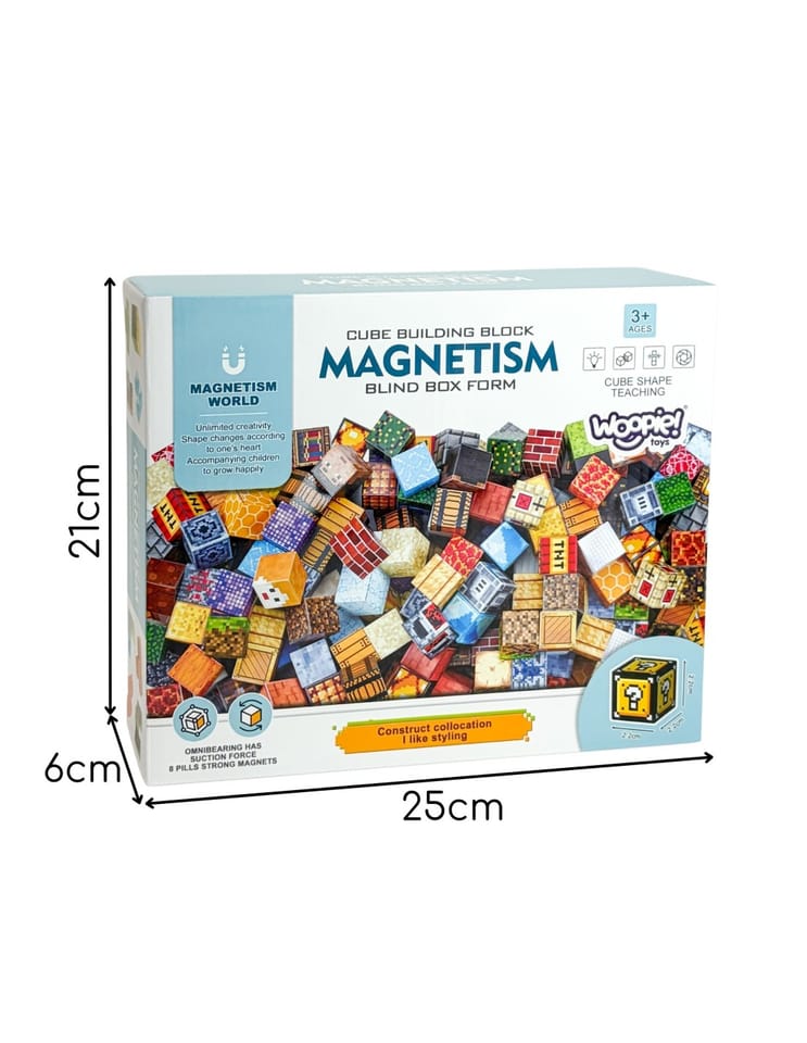 Magnetyczne klocki CUBE BUILDING BLOCK MAGNETISM – BLIND BOX FORM to wyjątkowa zabawka, która łączy naukę, kreatywność i świetną zabawę. Dzięki aż 63 elementom w formie kolorowych sześcianów dzieci mogą tworzyć budowle, postacie i konstrukcje inspirowane popularnymi grami. Prosty system łączenia na magnes sprawia, że układanie jest wygodne, stabilne i rozwija zdolności manualne. To idealna propozycja dla dzieci od 3 roku życia – zarówno do zabawy w domu, jak i w podróży. Zestaw dodatkowo zapakowany jest w praktyczny worek, co ułatwia przechowywanie i przenoszenie.