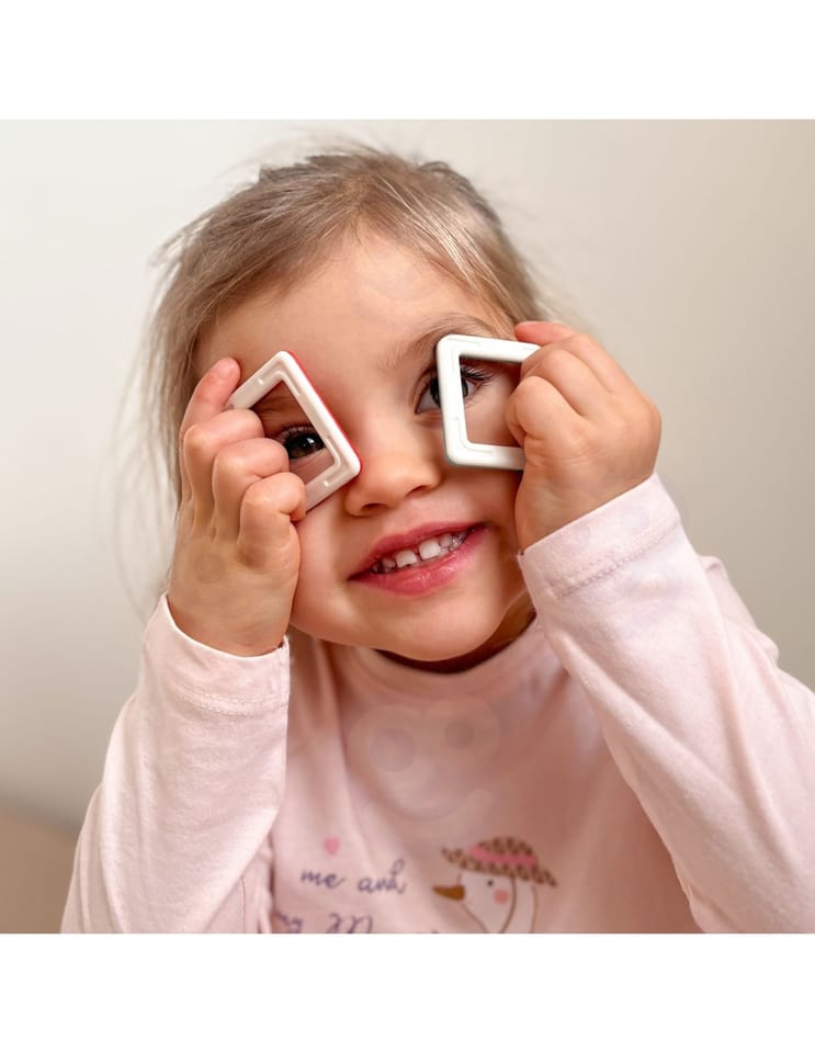 - - W zestawie znajdują się klocki geometryczne (kwadraty, trójkąty) i podstawa z kółkami.