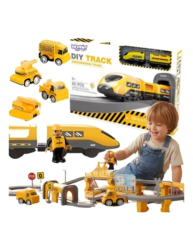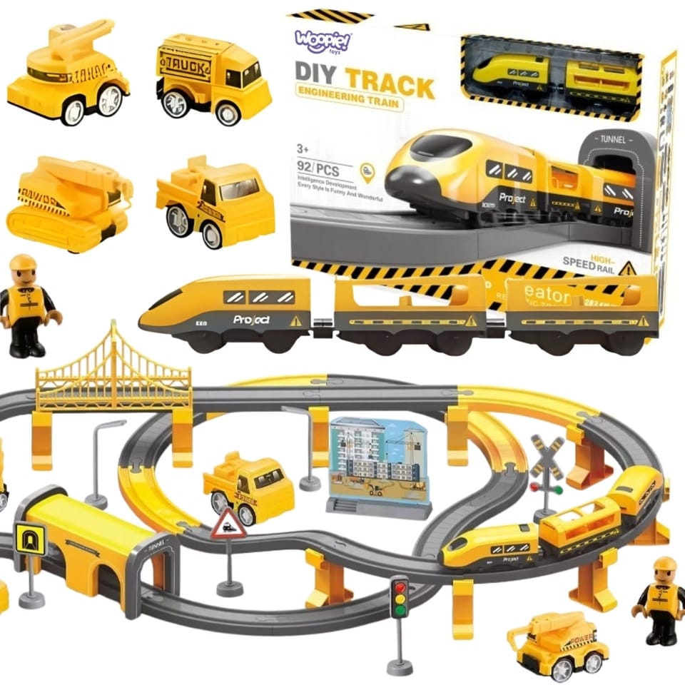 Fascynujący zestaw kolejki elektrycznej marki Woopie to prawdziwe centrum dowodzenia dla małych konstruktorów! Żółty pociąg ekspresowy z dźwiękami rzeczywistego pojazdu szynowego wprowadzi dziecko w świat budowy, planowania tras i tworzenia własnych scenariuszy zabawowych. Dzięki bogatemu wyposażeniu w mosty, tunele, sygnalizację świetlną i pojazdy budowlane, maluch może komponować nieograniczoną liczbę układów torowych, a następnie obserwować, jak pociąg mknie przez ich autorskie miasto. To zabawka, która łączy ekscytację prawdziwej kolei z kreatywnością dziecięcego świata