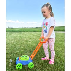 Bańki puszczane są automatycznie. Mały wiatraczek znajdujący się w górnej części obudowy silnika kosiarki, wytwarza strumień powietrza, który kierowany jest na 8 kręcących się pierścieni. Zanurzają się one w pojemniku na płyn do wytwarzania baniek i po kolei podsuwają pod małą dyszę. W ten sposób bańki puszczane są nieustannie. Dzięki 8 pierścieniom, zabawka wytwarza równocześnie dużą liczbę baniek. Dodatkową zaletą kosiarki są wydawane przez nią dźwięki. Dźwięki jakie możemy usłyszeć to dźwięk baniek mydlanych oraz melodia z bajki. Przy tylnych kółkach umieszczone zostały plastikowe zakładki, które podczas jazdy terkoczą imitując tym samym odgłos wydawany przez prawdziwe urządzenie. Bajecznie kolorowa kosiarka to propozycja niekończącej się zabawy, pobudzającej kreatywność i rozwijającej zdolności manualne. Możesz mieć pewność, że maluch nie będzie miał czasu na nudę.