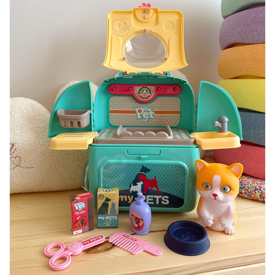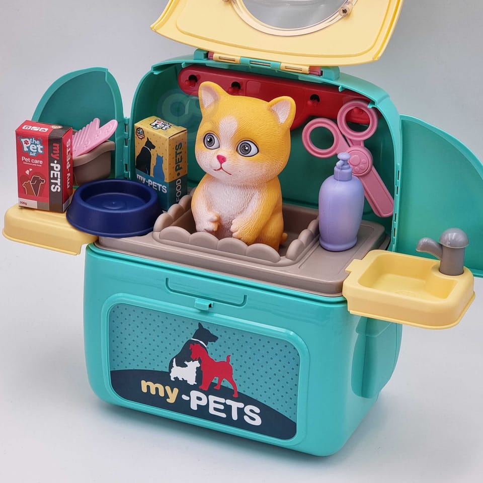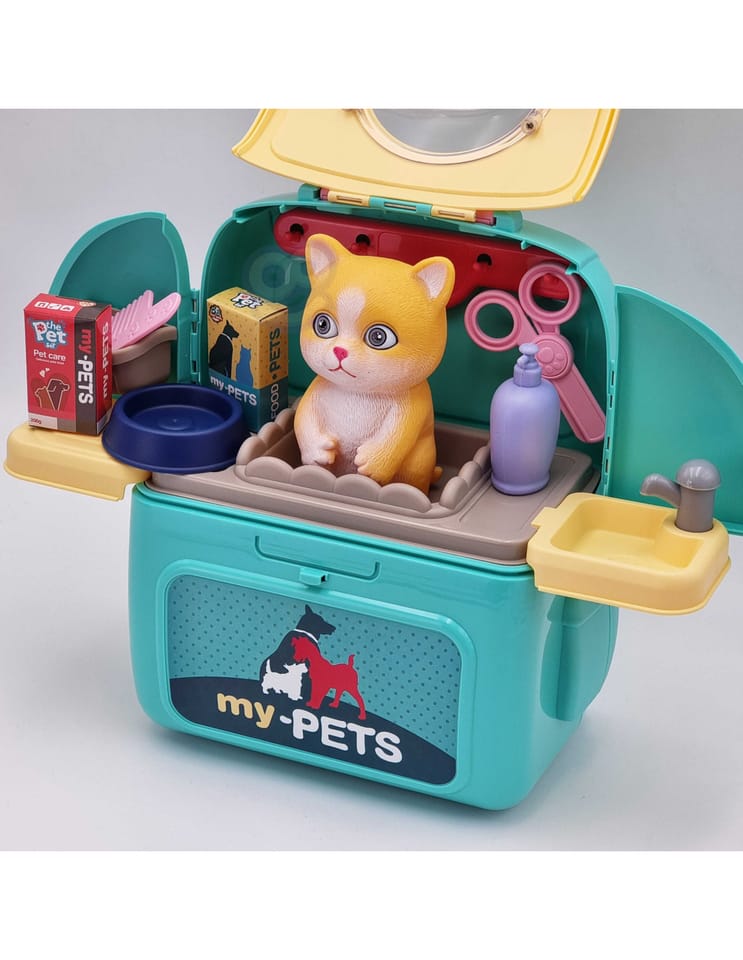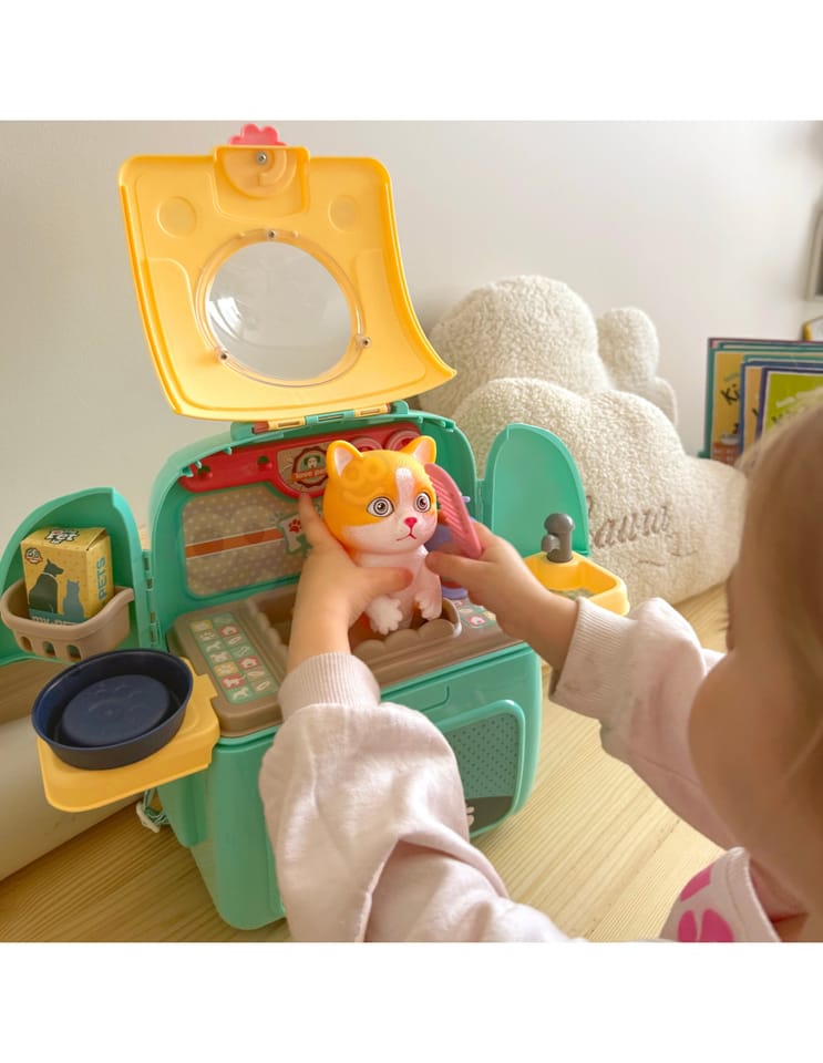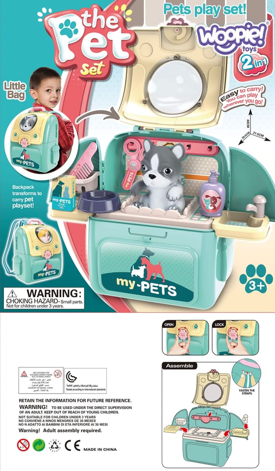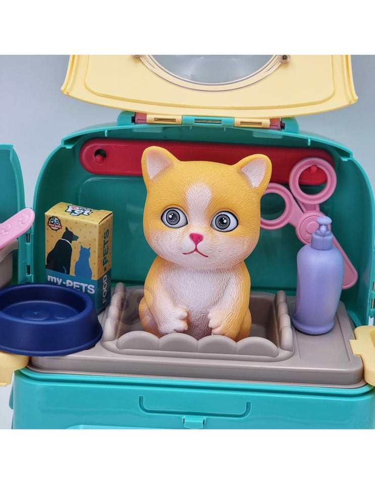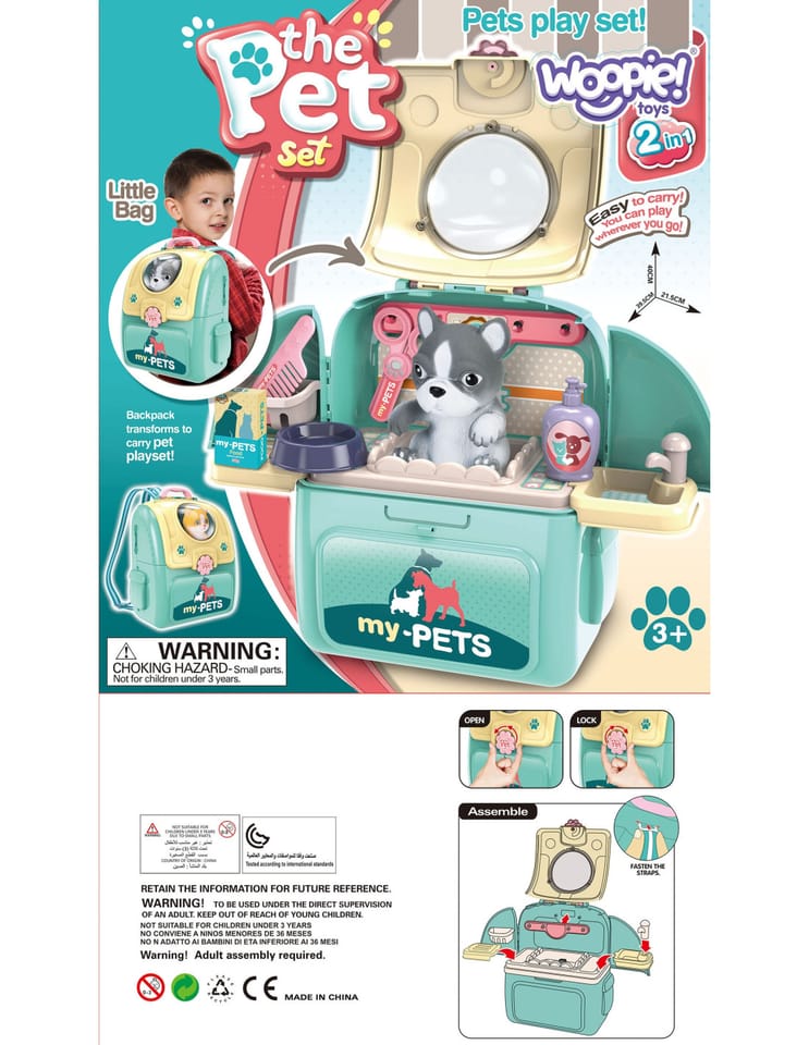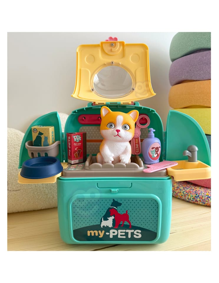 Przenośny Zestaw Pielęgnacyjny dla Kotka od marki WOOPIE pozwoli Twojemu dziecku zadbać o swojego ulubionego pupila. Możesz zabrać wszędzie swojego kota w wygodnym przenośnym plecaku: w podróż, na plac zabaw czy do przedszkola. Plecak posiada uchwyt do podnoszenia oraz specjalne zamknięcie, które nie pozwoli otworzyć się kabinie podczas przenosin i zapewni maksymalne bezpieczeństwo zwierzakowi. Zestaw pielęgnacyjny 2w1 zawiera: figurkę kotka, plecak, pasek (do zakładania kabiny na plecy), miskę, nożyczki, grzebień, koszyk na akcesoria, 2 pudełeczka na karmę, szampon, zlew, kran, półka i wieszak. Zestaw zawiera wszystko co potrzebne do pielęgnacji pupila. Dziecko może umyć i nakarmić swojego kota. Dziecko wcielając się w opiekuna lub weterynarza rozwija swoją wyobraźnie oraz poczucie empatii. Możliwe, że zabawka będzie początkiem do rozwinięcia pasji i drogi do zostania weterynarzem.
