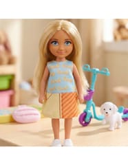- - Śliczny wygląd lalki - blond włosy, niebieskie oczy, ubrana w modną bluzeczkę z nadrukiem i beżowo-pomarańczową spódniczkę w paski.