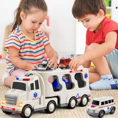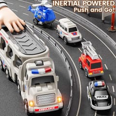 Duży Zestaw Ratunkowy Ciężarówka+4 Auta od Marki Woopie Zaprojektowana z myślą o małych pasjonatach straży pożarnej, policji,pogotowia ta zabawka 5 w 1 to idealny zestaw dla każdego małego ratownika! Naciśnij przycisk na górze kabiny ciężarówki, aby zobaczyć jasne migające światła i usłyszeć realistyczne syreny, bardzo atrakcyjne dla dzieci. Zestaw zawiera dużą ciężarówkę transportową oraz cztery pojazdy ratunkowe: samochód strażacki, radiowóz, helikopter policyjny, karete. Każdy z pojazdów ma ruchome elementy, które pozwolą Twojemu dziecku poczuć się jak prawdziwy bohater podczas akcji ratunkowych! Zestaw jest świetnym pomysłem na prezent urodzinowy, świąteczny czy na inne okazje.