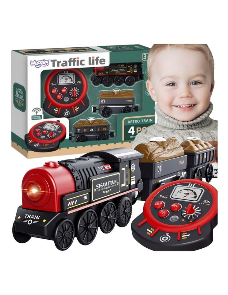 Przenieś swoje dziecko w fascynujący świat kolei z Kolejką Retro Zdalnie Sterowaną od marki Woopie! Ten 4-częściowy zestaw zapewnia mnóstwo kreatywnej zabawy, w której maluch może wcielić się w rolę prawdziwego maszynisty. Realistyczny wygląd lokomotywy parowej, efekty świetlne i dźwiękowe , specjalny pilot w kształcie panelu sterowania sprawiają, że zabawa jest niezwykle wciągająca. Kolejka składa się z lokomotywy i dwóch wagonów towarowych. Zabawka przeznaczona jest dla dzieci od 3 roku życia. Zdalne sterowanie rozwija zdolności manualne i koordynację wzrokowo-ruchową, a jednocześnie dostarcza wielogodzinnej, pasjonującej rozrywki!