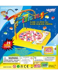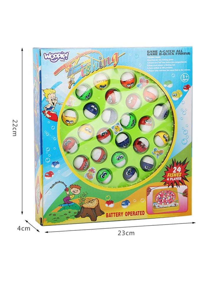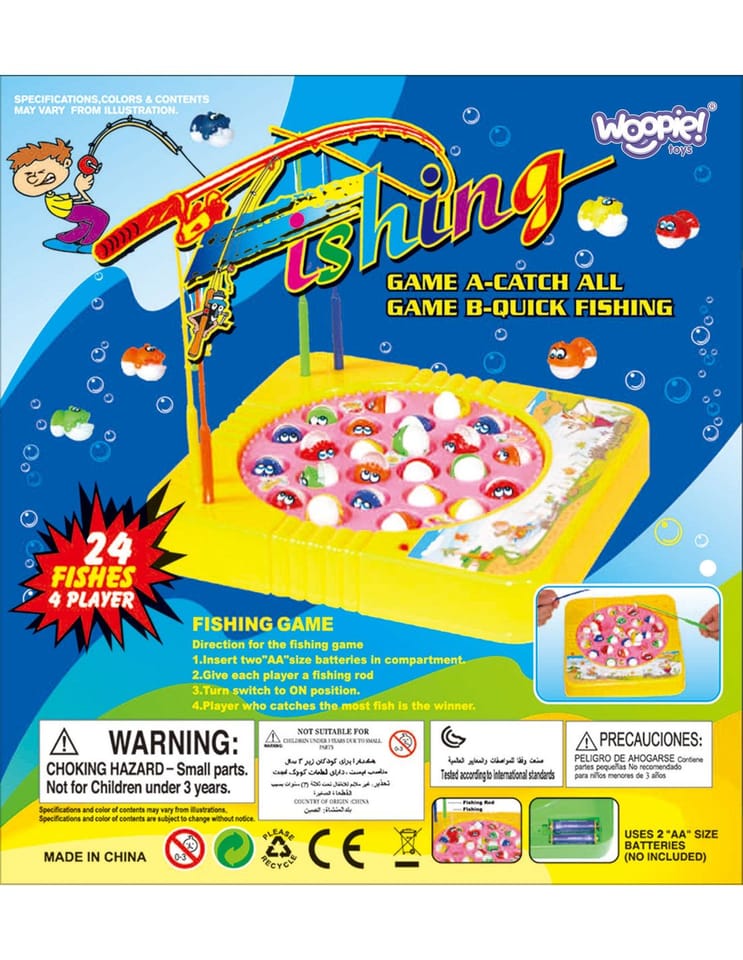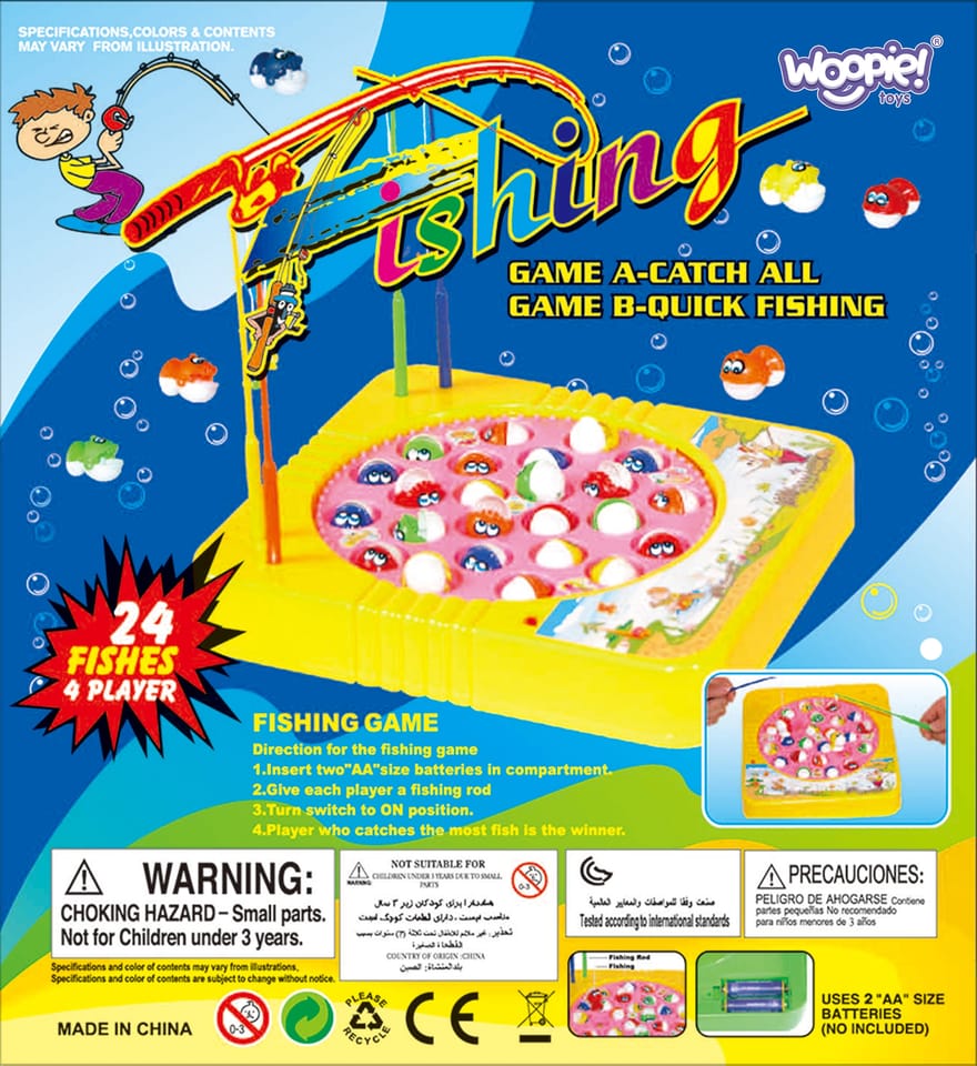 - - Zestaw zawiera: 4 kolorowe wędki, planszę do gry, 24 ryby