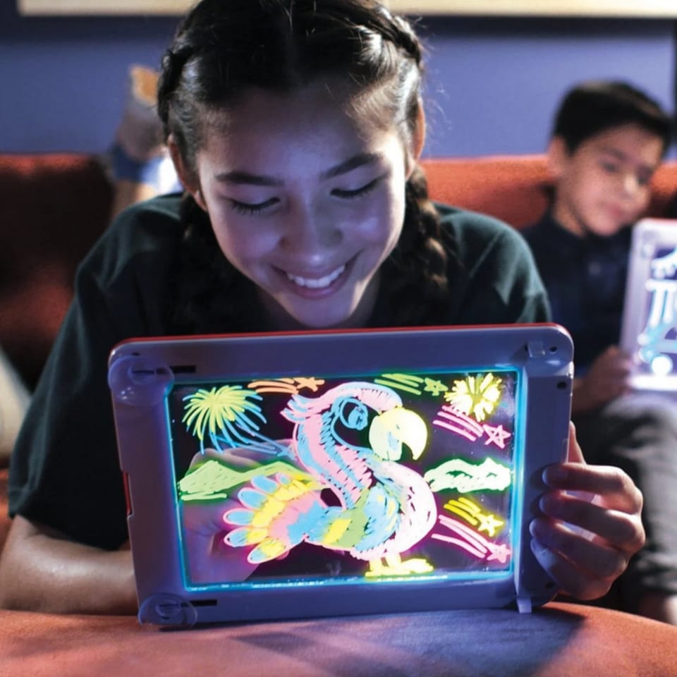 Magiczny Tablet Do Rysowania marki WOOPIE to podświetlana tablica do rysowania, która sprawia, że prace świecą neonowym blaskiem i przyciągają wzrok po włączeniu efektów LED. Ścieralna powierzchnia, neonowe mazaki i szablony zamieniają rysowanie, naukę liter i liczenia w atrakcyjną, czystą zabawę.