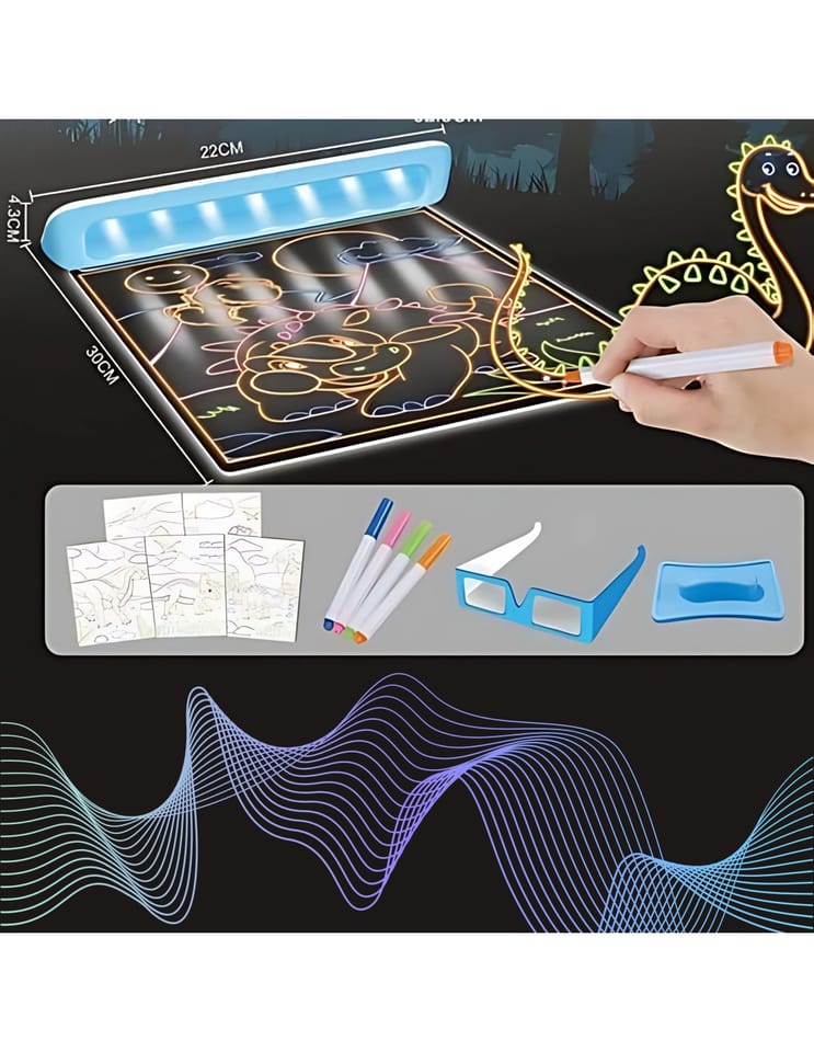 - - Po narysowaniu obrazka i włączeniu podświetlenia LED, wystarczy założyć dołączone okulary, by rysunek zyskał trójwymiarowy efekt