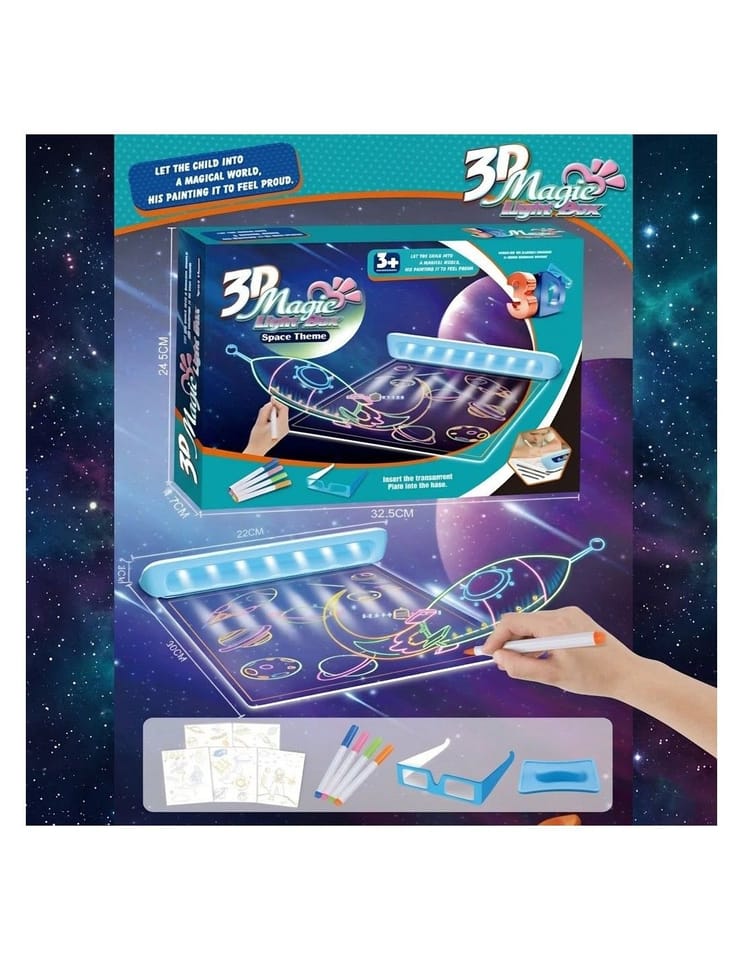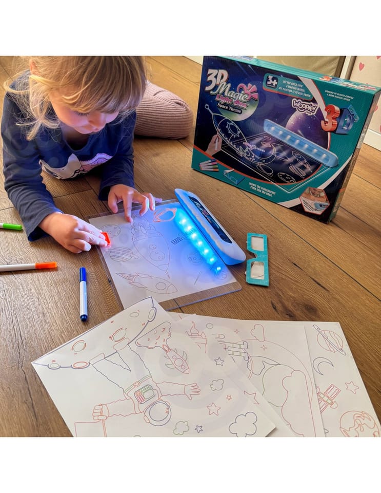 Odkryj magię rysowania z kosmiczną tablicą świetlną Woopie! Ten niezwykły, podświetlany ekran to dla Twojego dziecka brama do kreatywnej podróży po galaktyce, gdzie zwykłe rysowanie zamienia się w świetliste widowisko. Twoja pociecha może stworzyć własne, błyszczące w ciemności planety, statki kosmiczne i obce cywilizacje. Dzięki wbudowanemu podświetleniu LED i specjalnym neonowym markerom, każdy rysunek ożywa, a dołączone okulary 3D sprawiają, że kosmos wydaje się być dosłownie na wyciągnięcie ręki. To nie tylko zabawa, to prawdziwa, kreatywna przygoda, która z dumą zaprezentuje talent małego artysty.