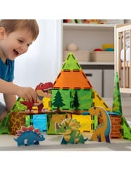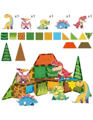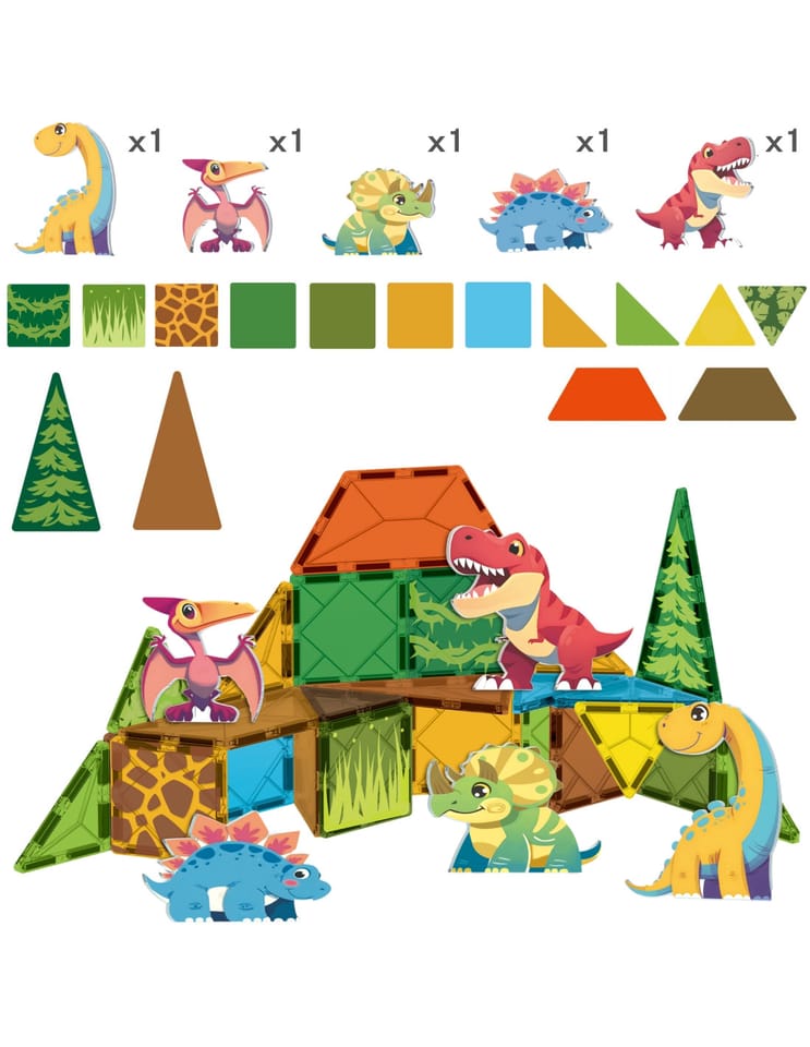 - 12 kwadratowych klocków magnetycznych z motywami dinozaurów i roślinności