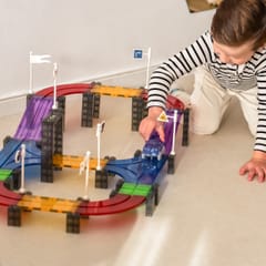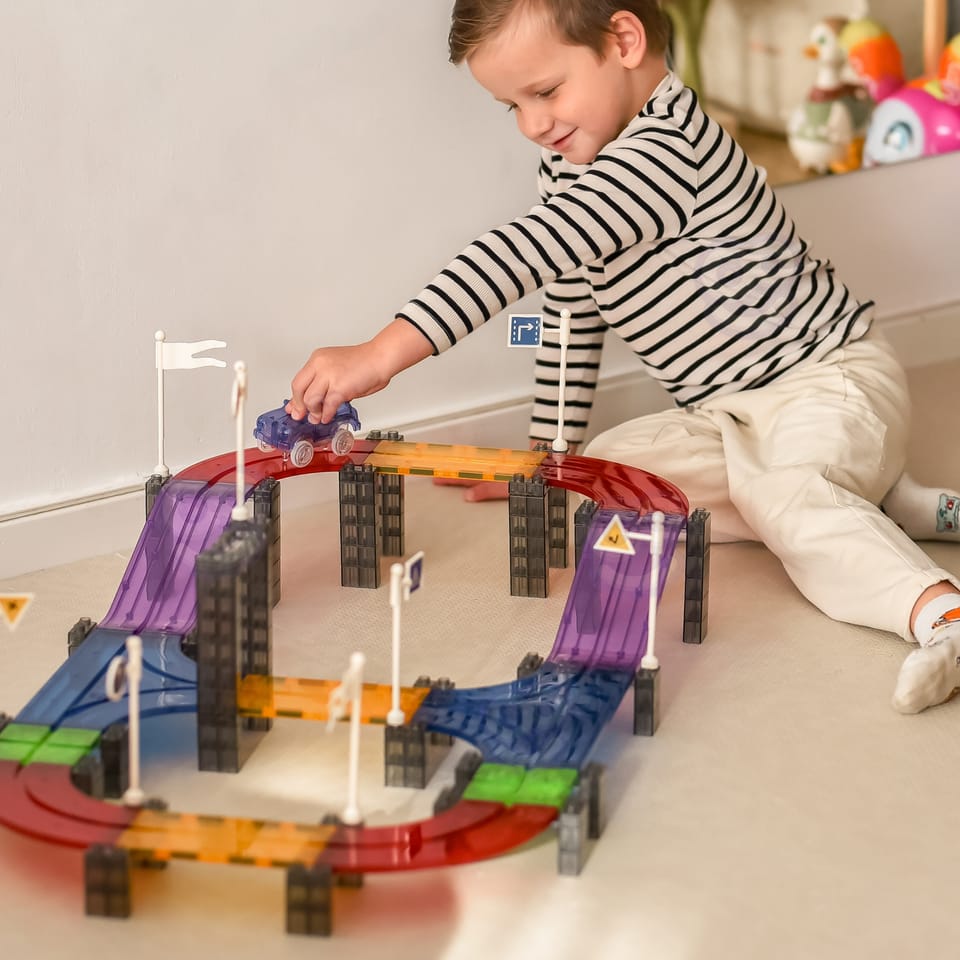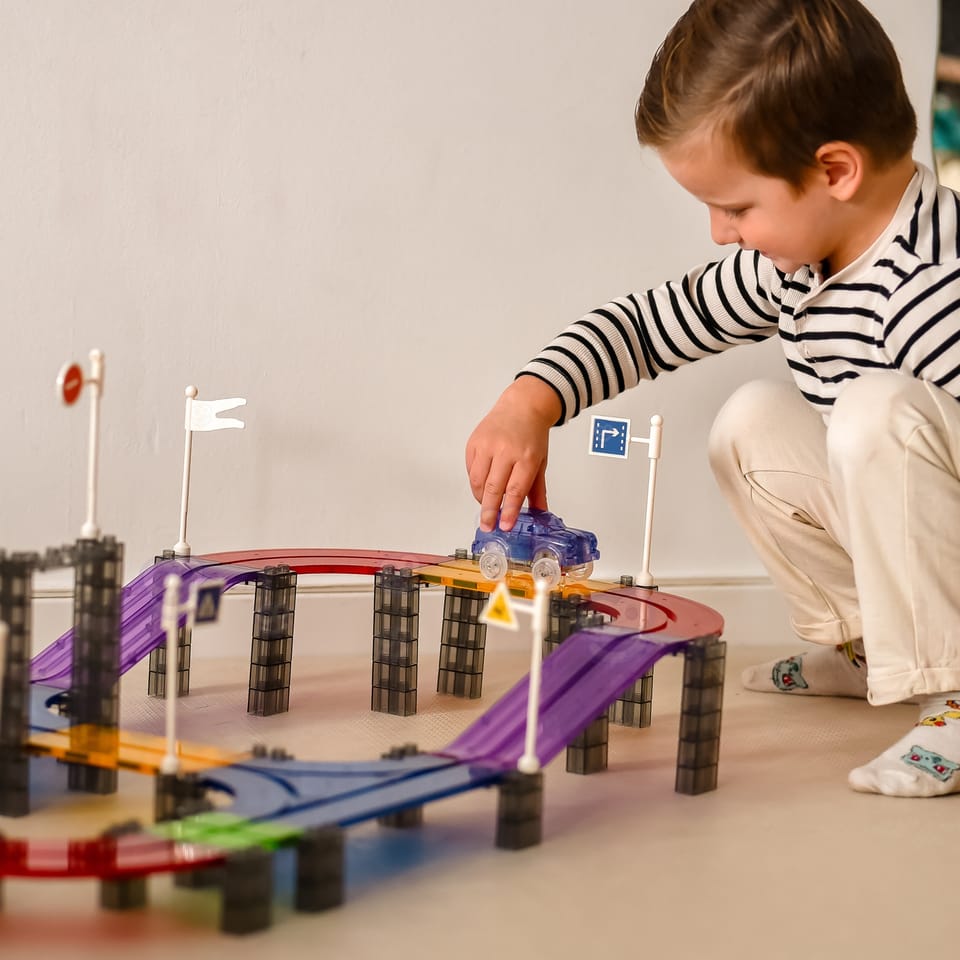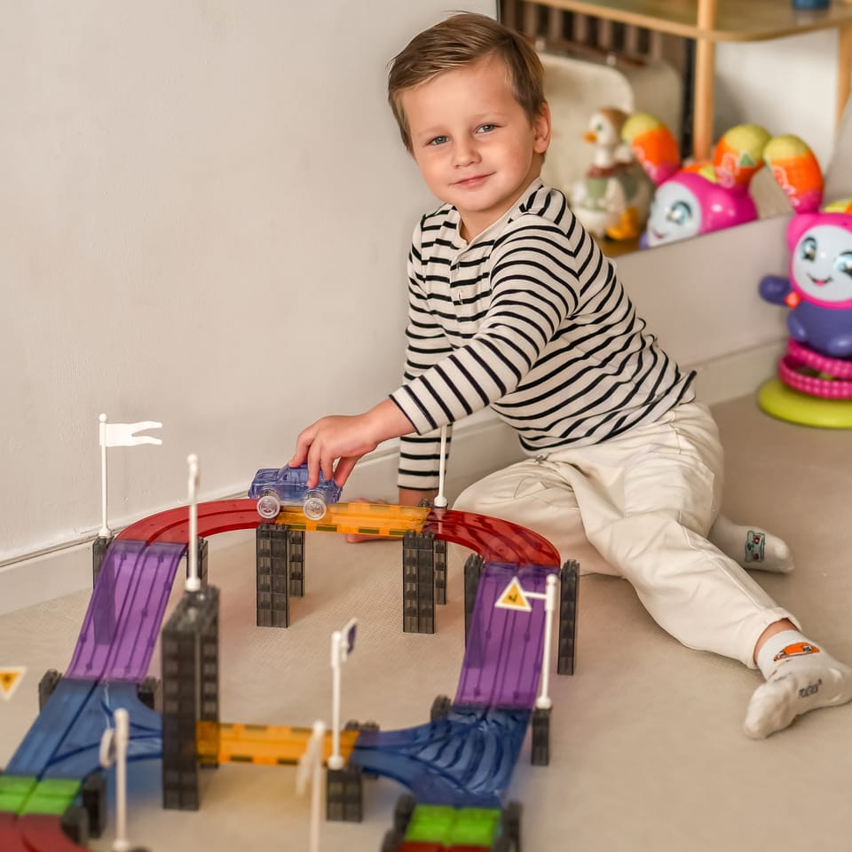 Magnetyczny Tor Wyścigowy marki Woopie to wyjątkowa zabawka, która rozbudzi kreatywność każdego dziecka i zamieni zabawę w niesamowitą przygodę pełną świateł i kolorów! Dzięki łatwym do łączenia magnetycznym elementom maluchy mogą samodzielnie budować różnorodne, wielopoziomowe tory, po których jeździ świecące terenowe autko. Przezroczyste, barwne części i efektowne światła LED sprawiają, że zabawa przyciąga uwagę oraz daje mnóstwo radości zarówno w dzień, jak i wieczorem.
