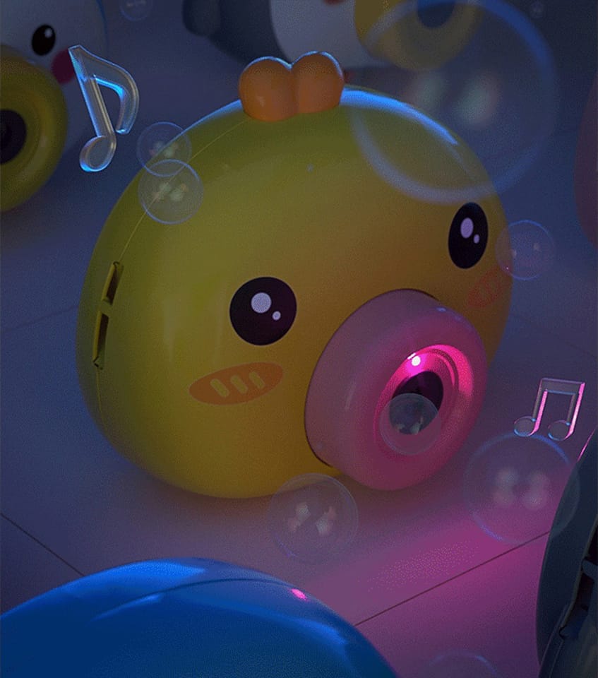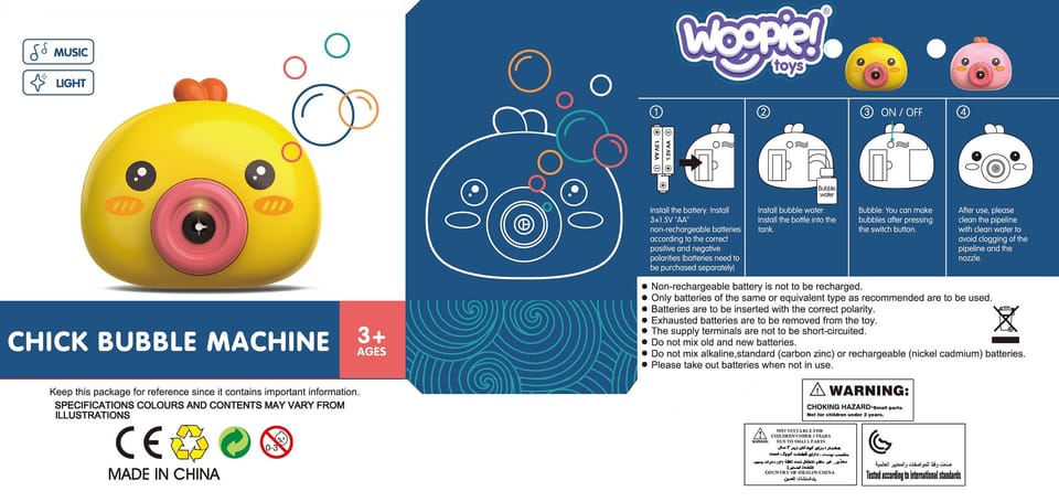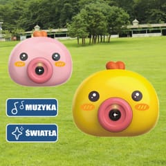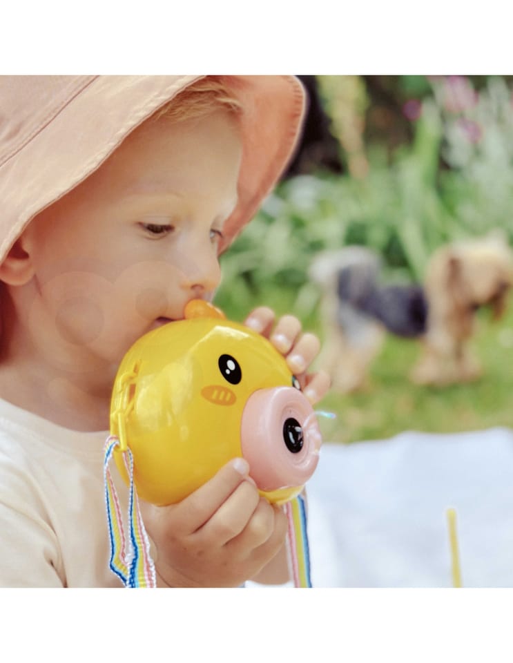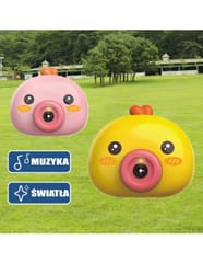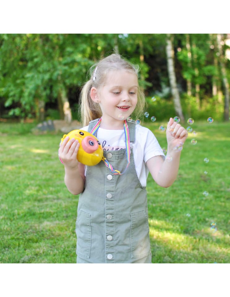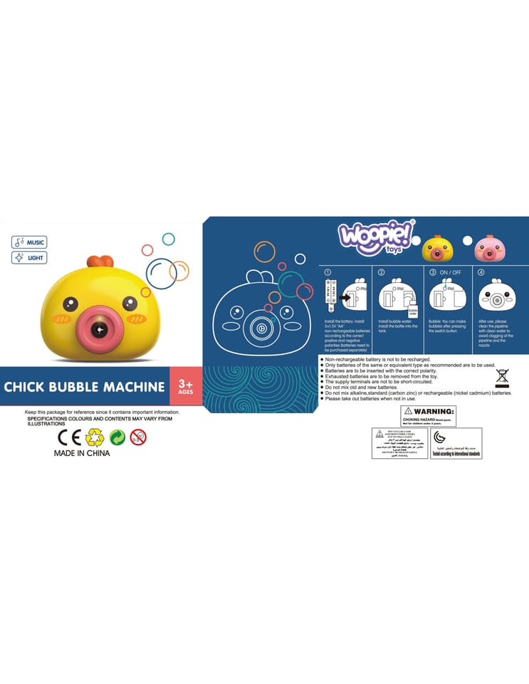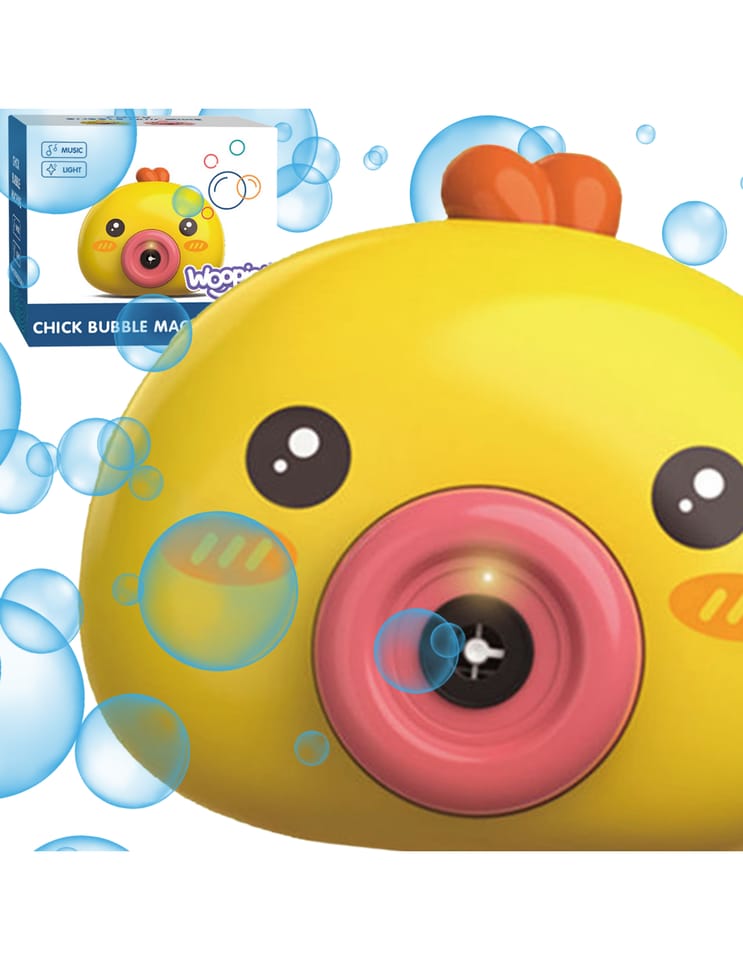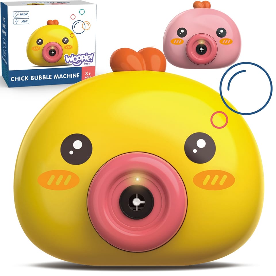Maszyna do robienia baniek w kształcie kurczaczka marki Woopie to świetna zabawka dla dzieci. Kurczaczek podczas puszczania baniek gra przyjemną dla ucha melodyjkę, która dodatkowo umila zabawę. Wypuszczone bąbelki wystrzeliwane są nie tylko z dużą częstotliwością, ale dodatkowo zainstalowany wiatraczek wydmuchuje je jeszcze dalej. Znajdziemy również pojemniczek na płyn na bańki oraz smycz, aby zawiesić zabawkę na szyi.