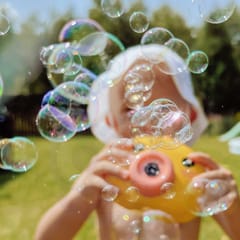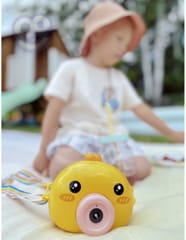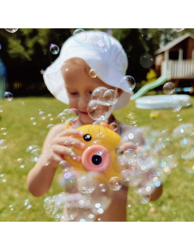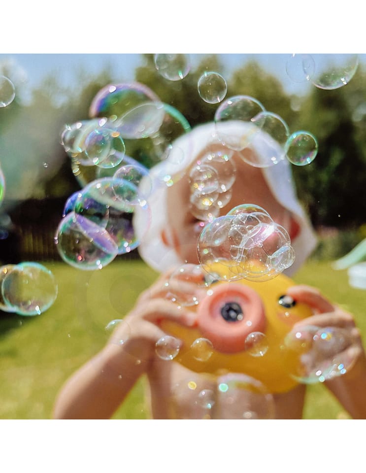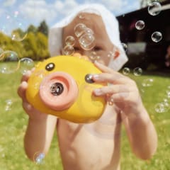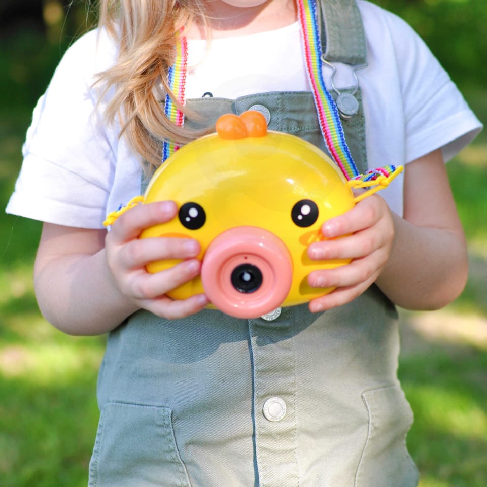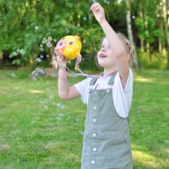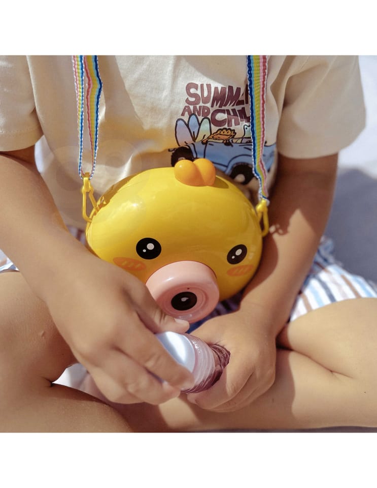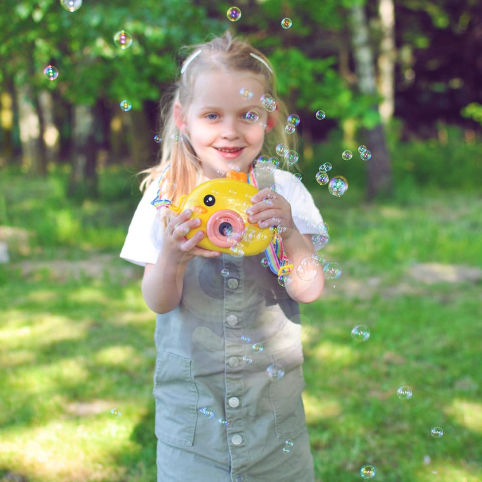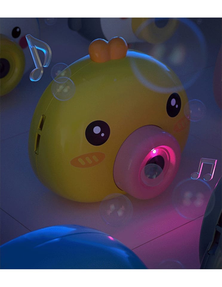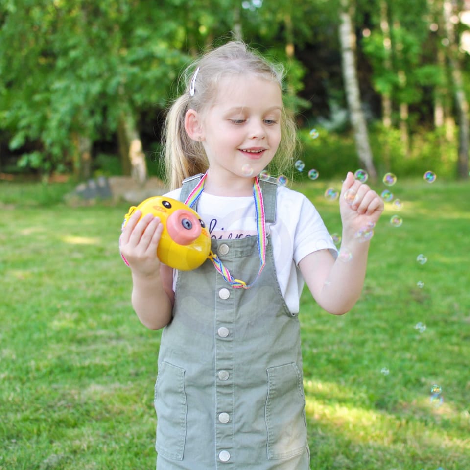 Maszyna do robienia baniek w kształcie kurczaczka marki Woopie to świetna zabawka dla dzieci. Kurczaczek podczas puszczania baniek gra przyjemną dla ucha melodyjkę, która dodatkowo umila zabawę. Wypuszczone bąbelki wystrzeliwane są nie tylko z dużą częstotliwością, ale dodatkowo zainstalowany wiatraczek wydmuchuje je jeszcze dalej. Znajdziemy również pojemniczek na płyn na bańki oraz smycz, aby zawiesić zabawkę na szyi.