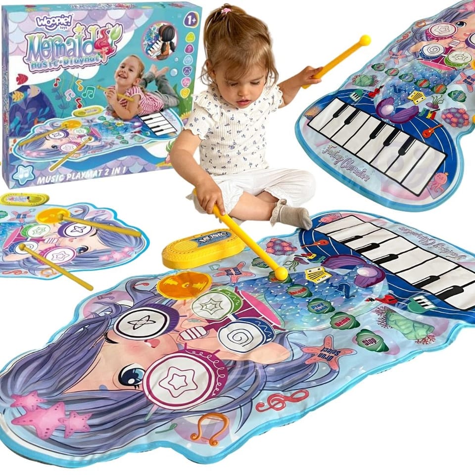 Odkryj magiczny świat muzyki i wyobraźni z matą muzyczną 2w1 z motywem syrenki od Woopie! Mata łączy funkcje pianinka, perkusji i zabawy sensorycznej w jednej interaktywnej formie. To idealne połączenie zabawy, ruchu i nauki. Zachwyci każdego malucha, który kocha muzykę i kolorowy świat podwodnych przygód. Zachwyca motywem syrenki, bogactwem dźwięków oraz funkcjami, które rozwijają zmysły i zdolności dziecka od najmłodszych lat. Wystarczy nacisnąć odpowiedni element, aby usłyszeć dźwięki instrumentów, melodyjki i rytmy! Dzięki zestawowi instrumentów, padom perkusyjnym i klawiaturze fortepianowej, maluch może wcielić się w małego muzyka, komponować własne rytmy, a jednocześnie doskonalić motorykę, słuch i kreatywność. To idealna zabawka dla dzieci już od pierwszego roku życia – bezpieczna, edukacyjna i zapewniająca pełno frajdy!
