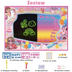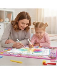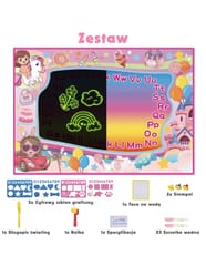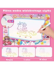 Rozpal wyobraźnię dziecka dzięki wielofunkcyjnej Macie Wodnej 2w1 marki Woopie! Ta wyjątkowa mata do rysowania łączy w sobie funkcje malowanie wodą oraz rysowanie światłem UV. Po kilku minutach rysunki stopniowo znikają, dając dziecku możliwość tworzenia nowych dzieł bez końca. Bajkowy dziewczęcy motyw pełny balonów, jednorożców, zamków i gwiazd przeniesie dziecko w magiczny świat kreatywnej zabawy. Wystarczy trochę wody by stworzyć kolorowe arcydzieła – bez tuszu, bez brudu, bez ryzyka zniszczeń. Idealna do zabawy solo lub z rodzeństwem, przyjaciółmi czy rodzicami. Mata poprawia zdolności manualne, koordynację ręka-oko i jest świetnym sposobem na naukę przez zabawę. Można z niej korzystać zarówno w domu jak i w ogrodzie.
