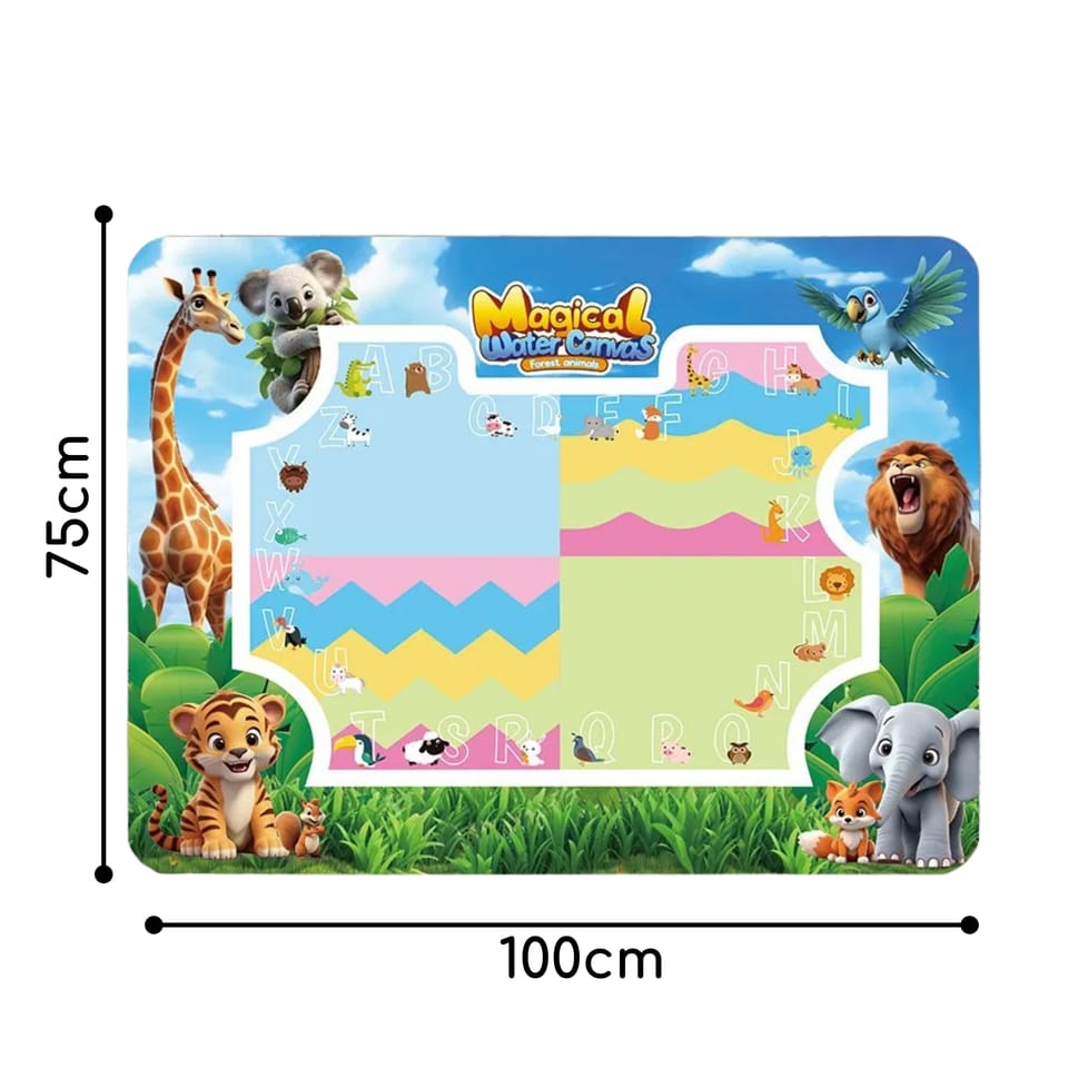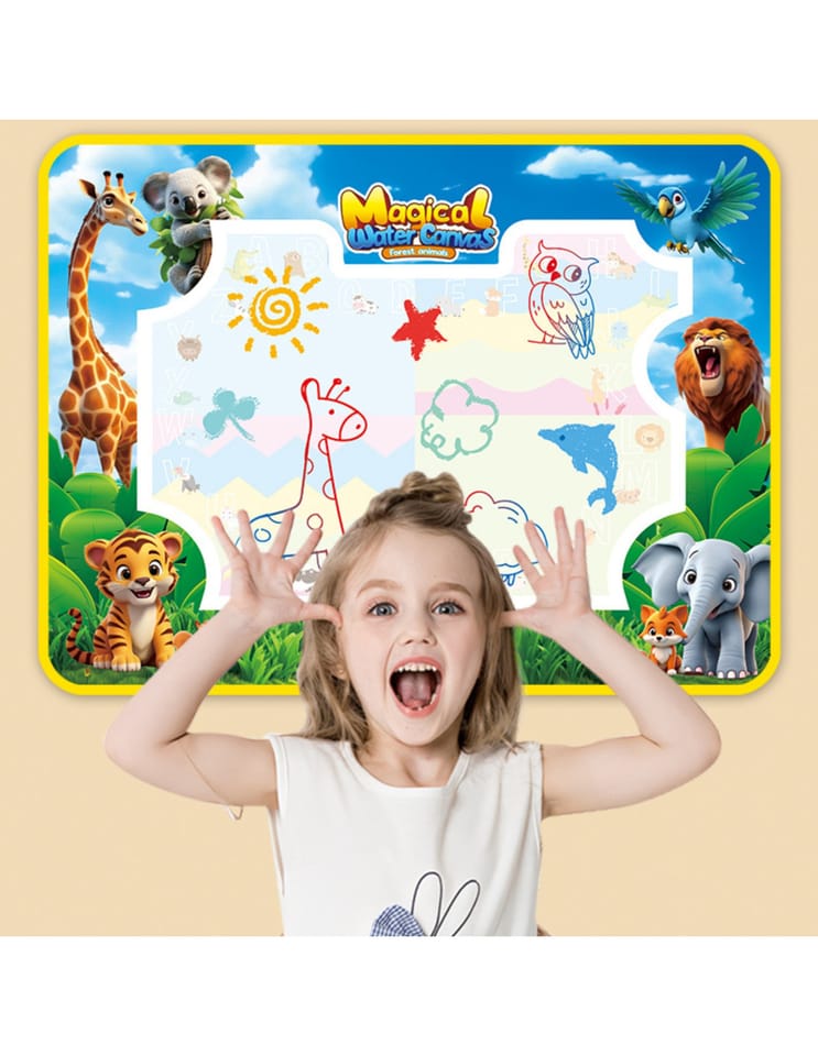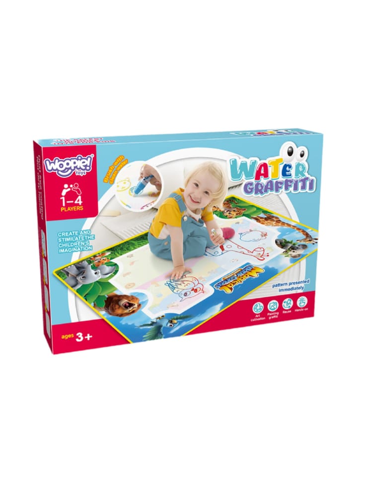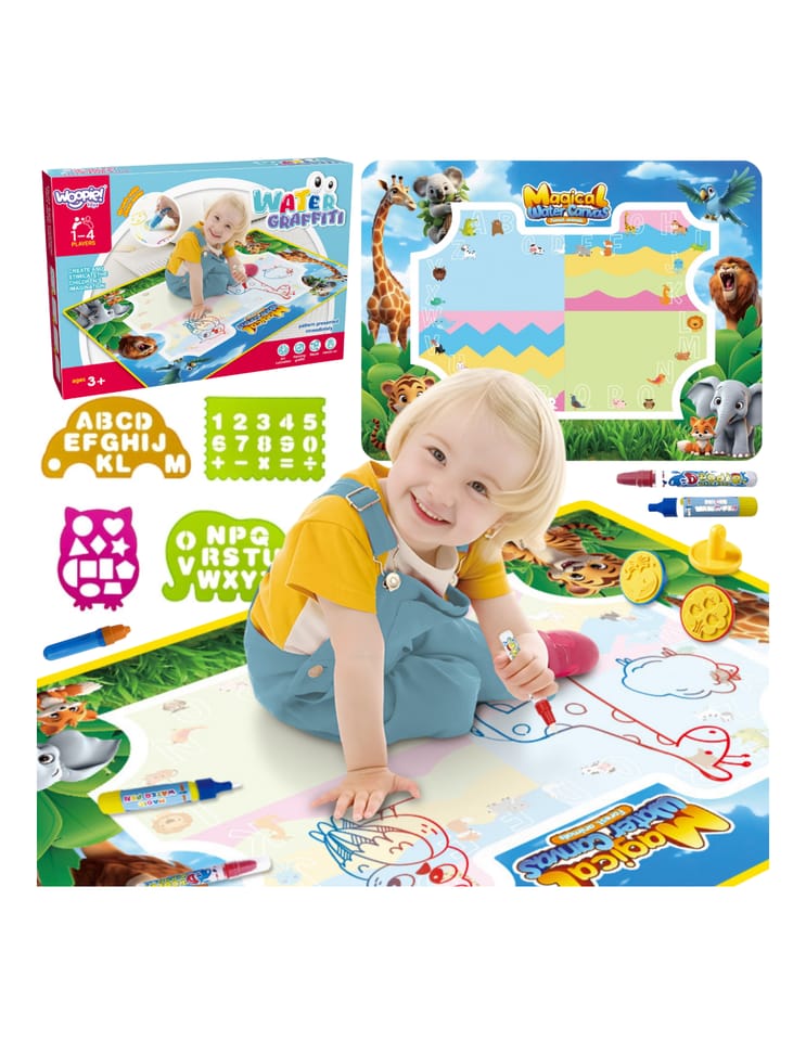 Mata do Malowania Wodą marki WOOPIE to edukacyjny zestaw artystyczny dla dzieci od 3 roku życia. Wystarczy napełnić dołączone pisaki czystą wodą, by odkrywać kolory, litery, liczby i kształty bez użycia tuszu i farb. Rysunki pojawiają się na chwilę, a po wyschnięciu znikają, zapraszając do kolejnej zabawy. Duży format 100×75 (cm) daje miejsce do wspólnego tworzenia, a wesoła grafika zwierząt z dżungli zachęca do nauki przez zabawę.