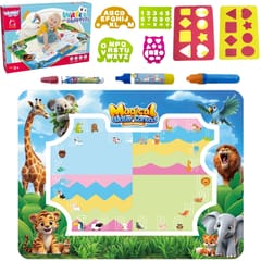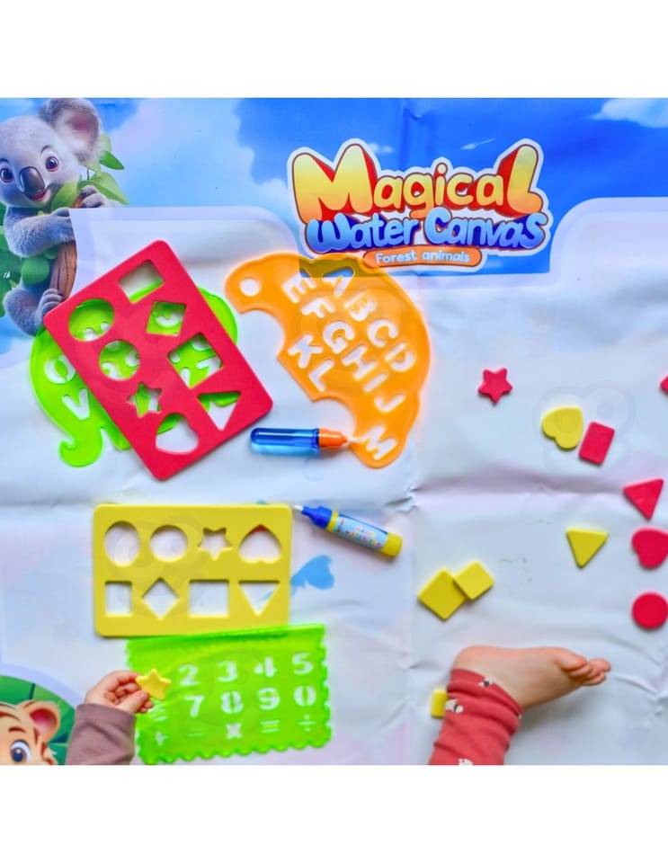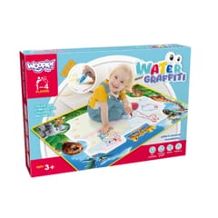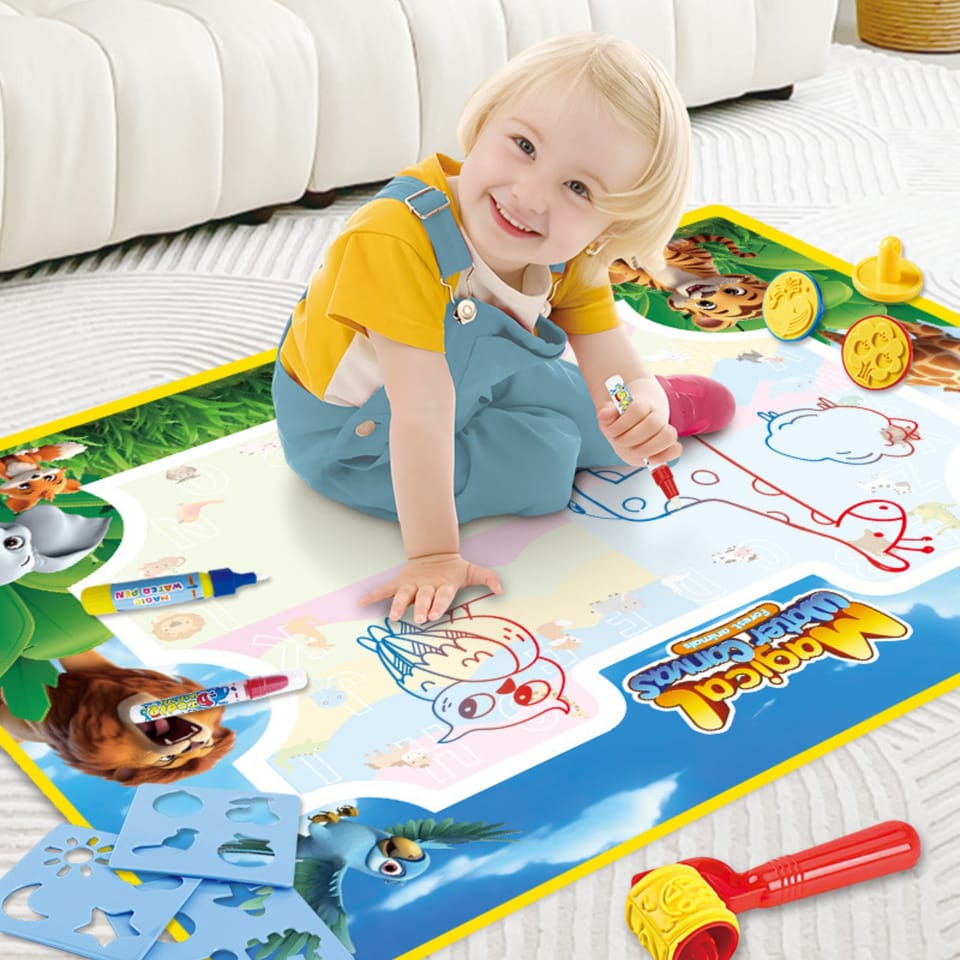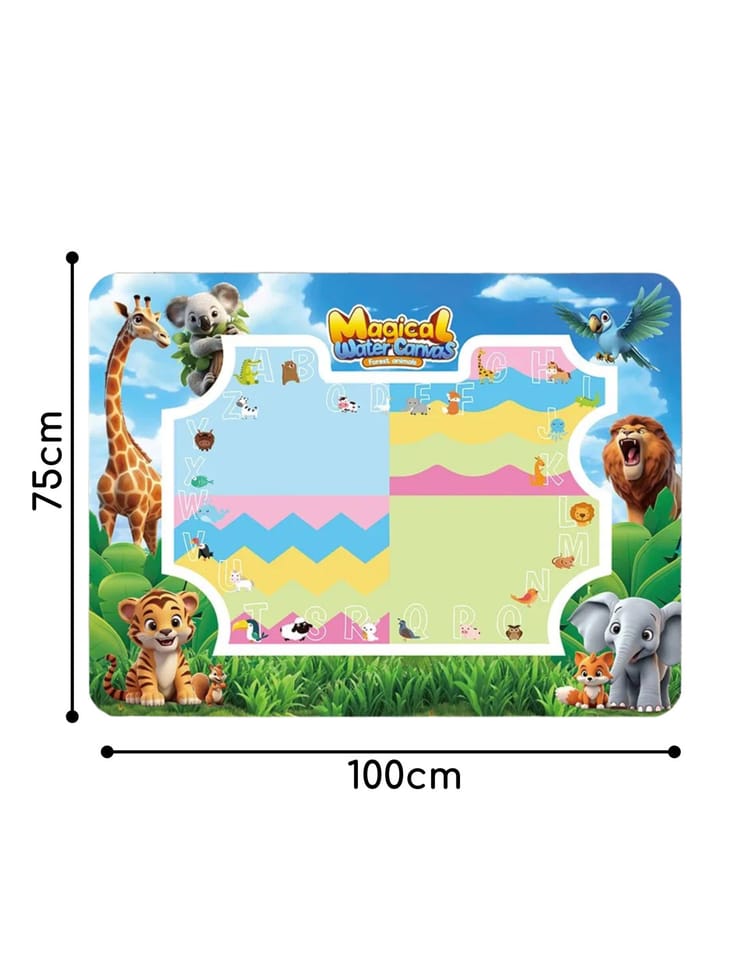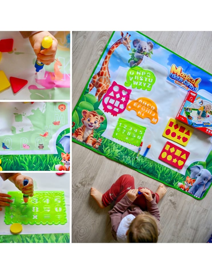 Mata do Malowania Wodą marki WOOPIE to edukacyjny zestaw artystyczny dla dzieci od 3 roku życia. Wystarczy napełnić dołączone pisaki czystą wodą, by odkrywać kolory, litery, liczby i kształty bez użycia tuszu i farb. Rysunki pojawiają się na chwilę, a po wyschnięciu znikają, zapraszając do kolejnej zabawy. Duży format 100×75 (cm) daje miejsce do wspólnego tworzenia, a wesoła grafika zwierząt z dżungli zachęca do nauki przez zabawę.