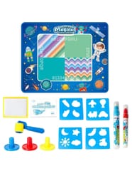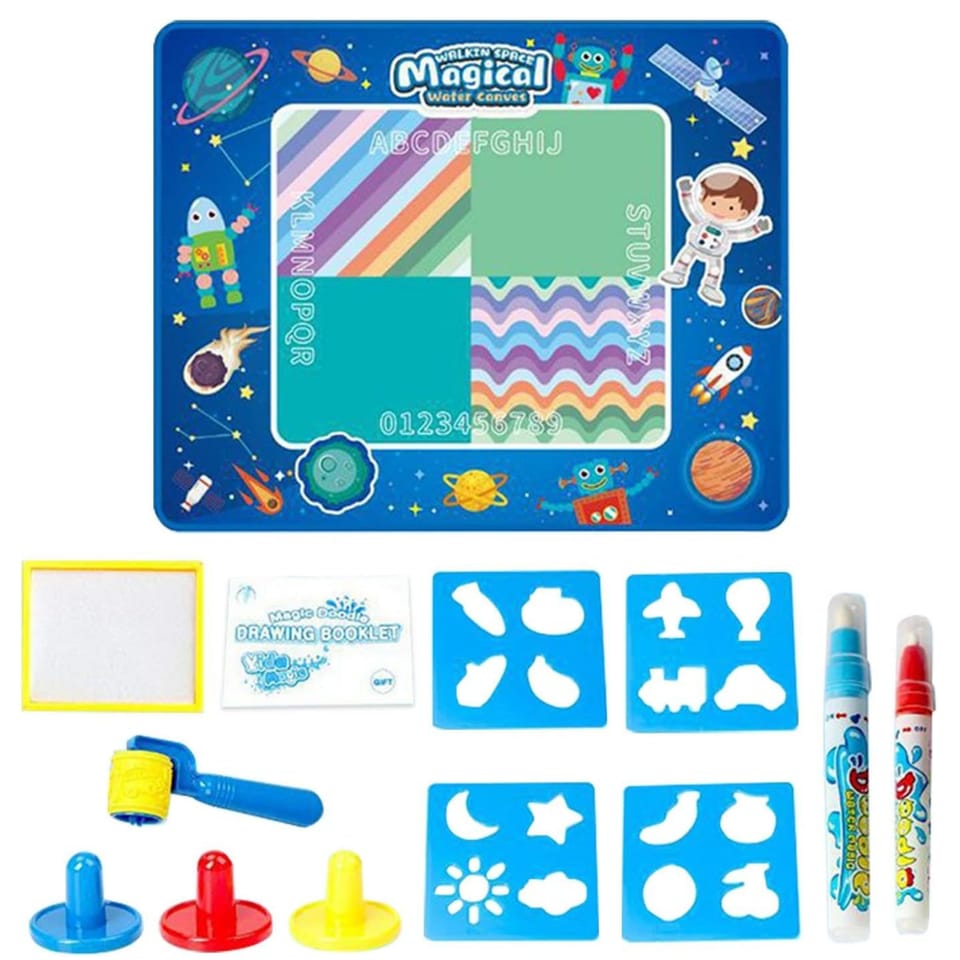 Mata wodna marki Woopie to innowacyjna zabawka edukacyjna, która umożliwia dzieciom tworzenie rysunków wyłącznie za pomocą wody – bez zabrudzeń i ryzyka poplamienia. Po kilku minutach rysunki stopniowo znikają, dając dziecku możliwość tworzenia nowych dzieł bez końca. Duża powierzchnia do malowania i bogaty zestaw akcesoriów zapewniają godziny bezpiecznej, kreatywnej zabawy w domu lub przedszkolu. Kosmiczny motyw maty z planetami, robotami, rakietami i astronautami zamieniają zwykłe rysowanie w podróż po galaktyce pobudzając wyobraźnię twojego dziecka. Mata poprawia zdolności manualne, koordynację ręka-oko i jest świetnym sposobem na naukę przez zabawę. Można z niej korzystać zarówno w domu jak i w ogrodzie.