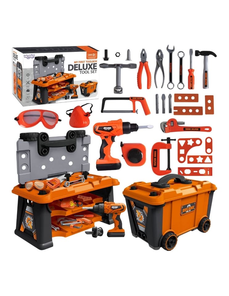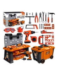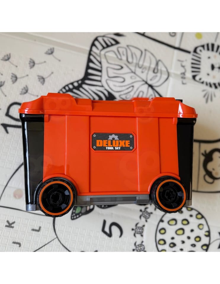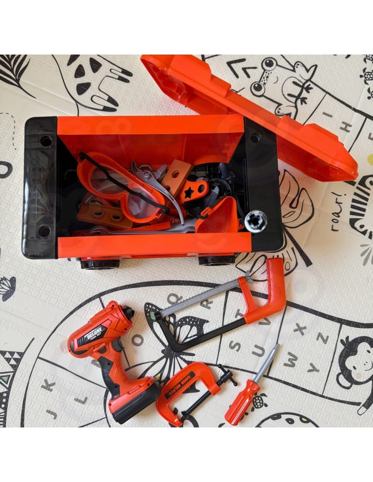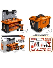 Mobilna Skrzynia Na Narzędzia Warsztat 2w1 Wykonana z solidnych tworzyw sztucznych z pomarańczowo-czarno-szarymi elementami, w łatwy i bezpieczny sposób pozwala dzieciom wcielić się w rolę prawdziwego fachowca. Ten funkcjonalny zestaw 2w1 to nie tylko warsztat, ale również walizka na kółkach, która stanie się ulubionym kompanem zabaw. Ten praktyczny zestaw wspiera kreatywną zabawę w odgrywanie ról i pozwala dzieciom na rozwijanie umiejętności manualnych poprzez zabawę.