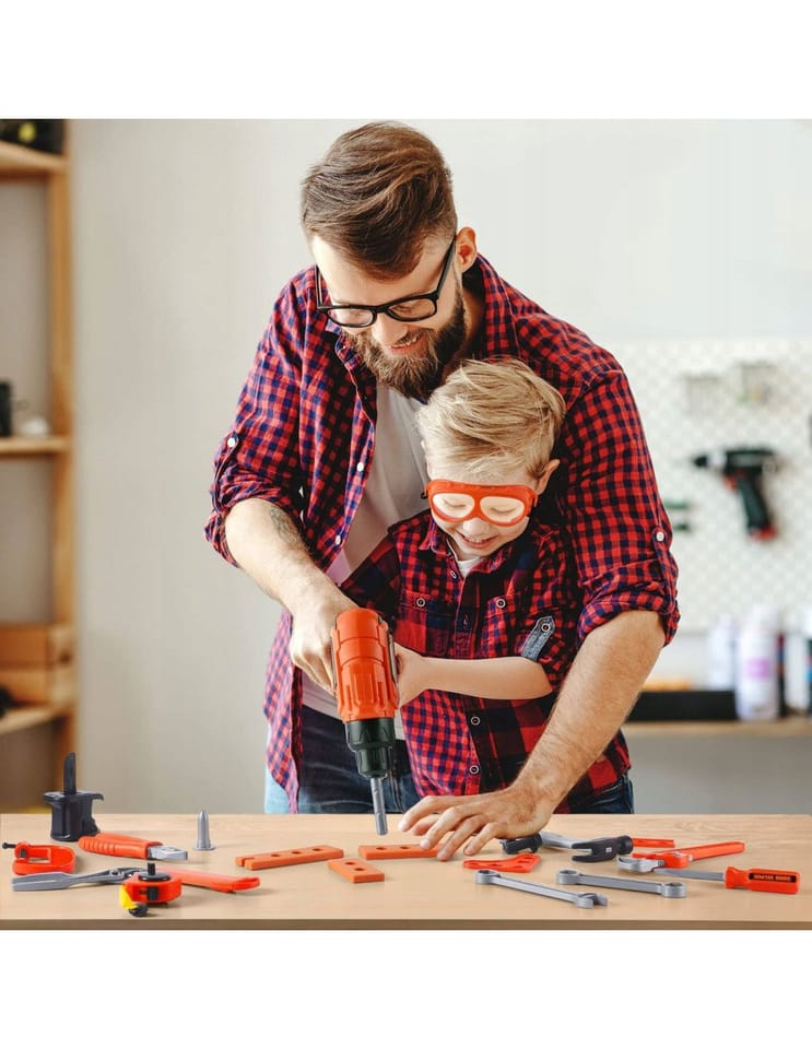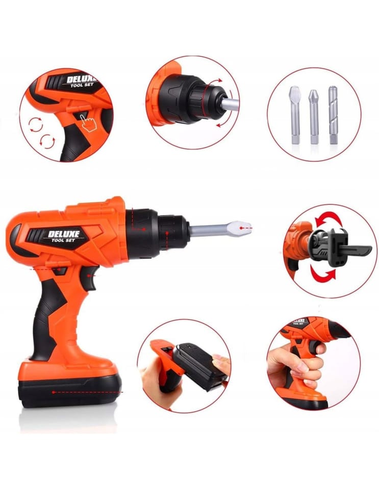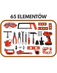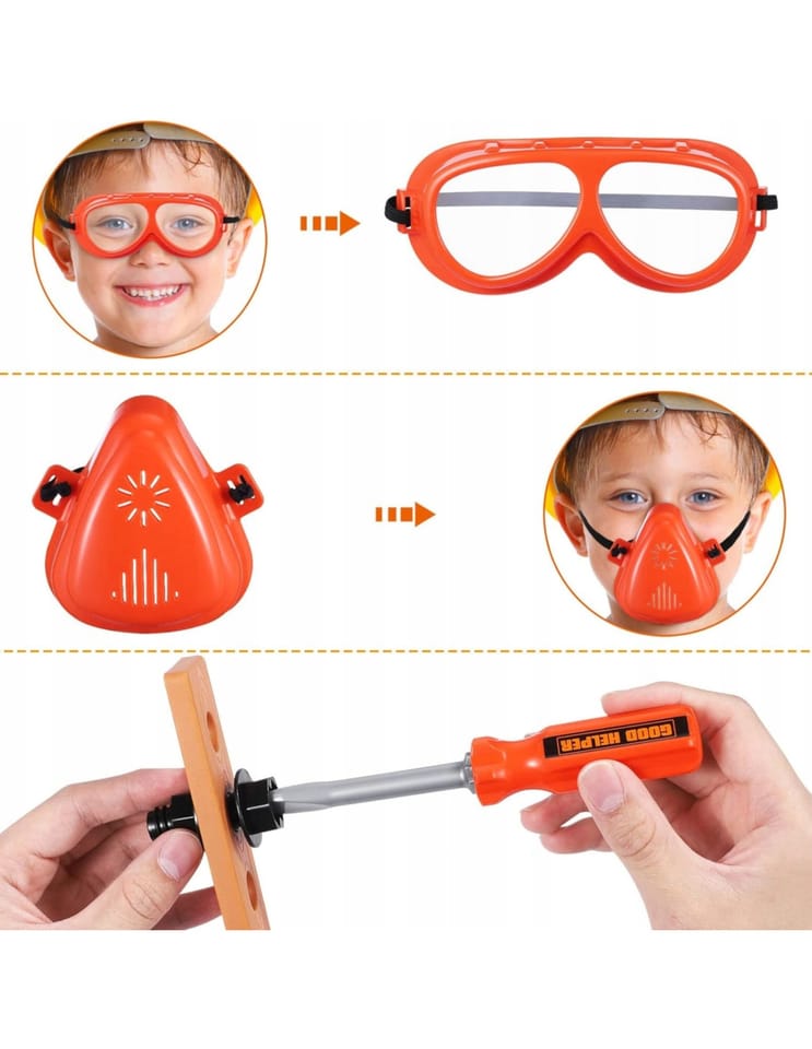 ◾Gogle ochronne◾ Piła ręczna◾ 3 Nawiercone deski (plastikowe)◾ Klucz typu T◾ Kombinerki◾ Szczypce◾ Klucz płasko oczkowy◾ Klucz oczkowy◾ Śrubokręt◾ Młotek◾ 3 bity do narzędzia wielofunkcyjnego - wiertło, wkrętak płaski, wkrętak gwiazdkowy◾ Narzędzie wielofunkcyjne◾ 2 głowice do narzędzia wielofunkcyjnego- wkrętarka i wyrzynarka◾ Maska ochronna◾ Ścisk stolarski◾ Klucz nastawny◾ Poziomica◾ Miarka◾ 16 śrub◾ 16 nakrętek◾ 6 wkrętów◾ 3 szablony konstrukcyjne