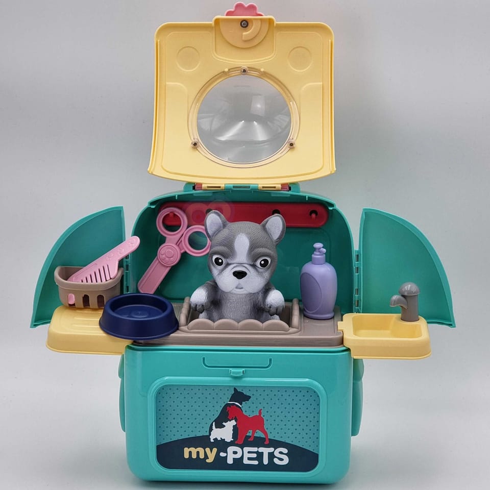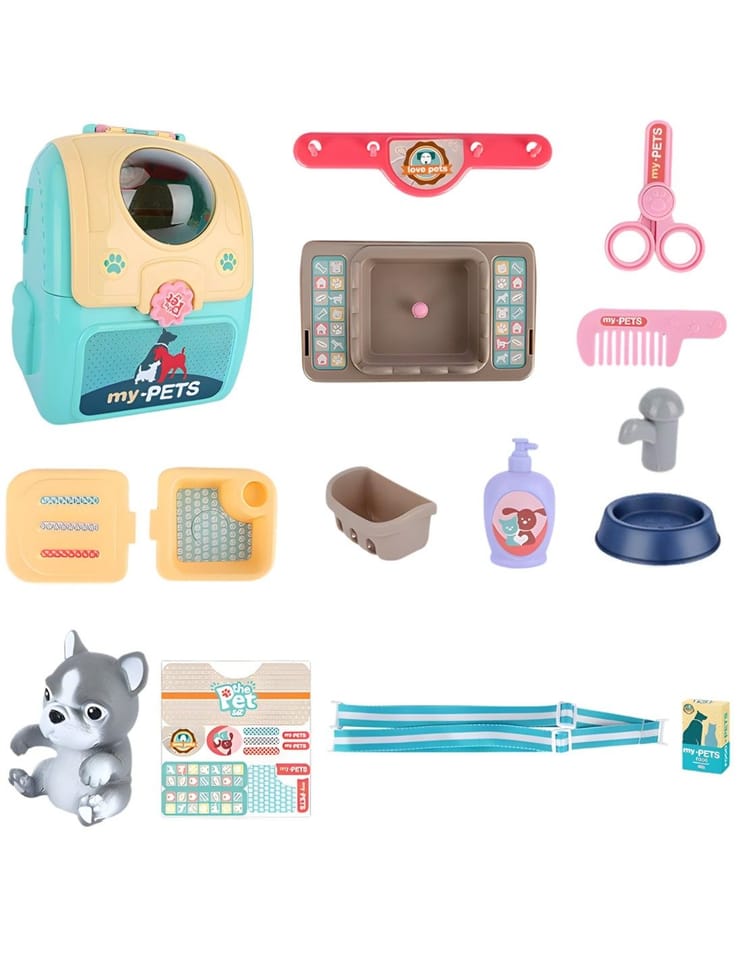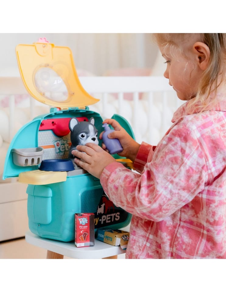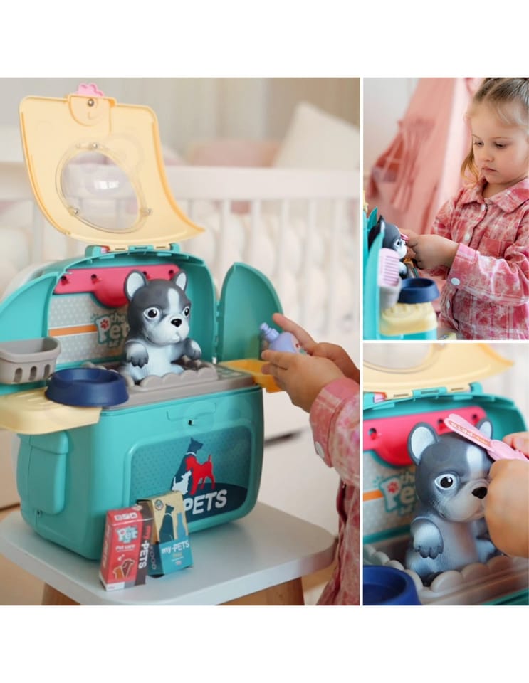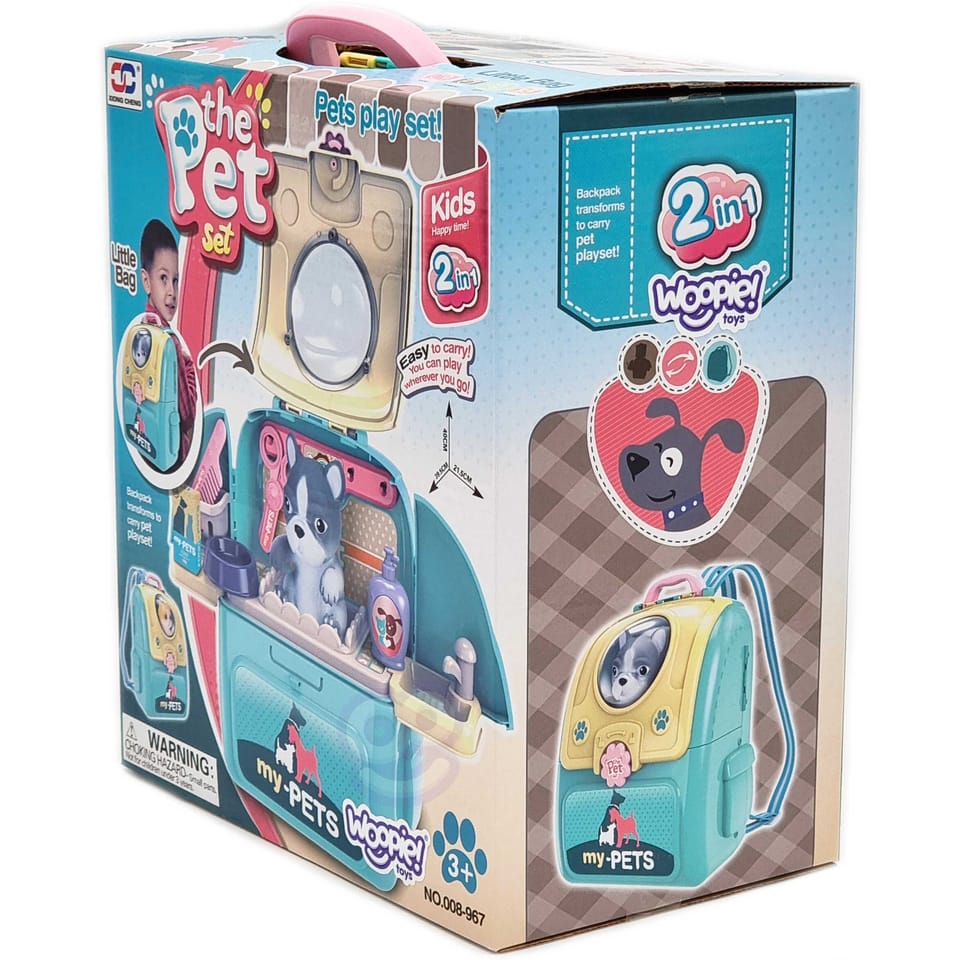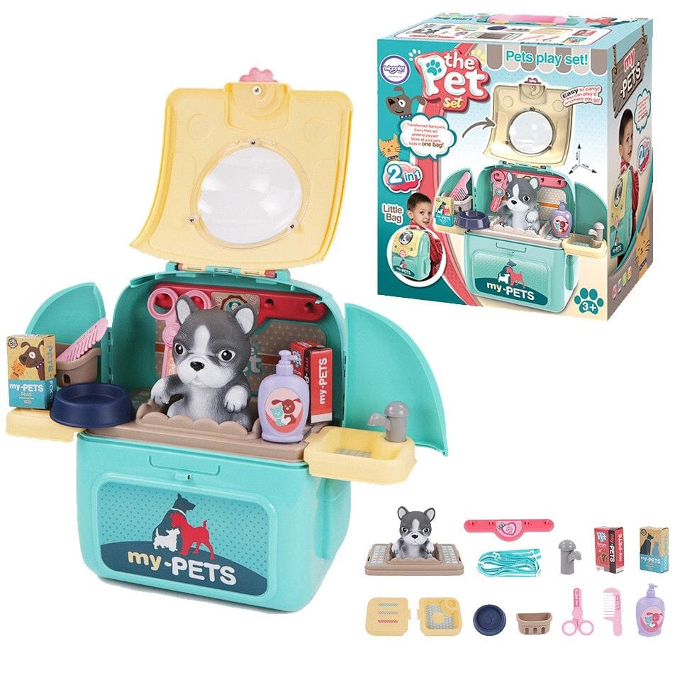 Przenośny Zestaw Pielęgnacyjny dla Pieska od marki WOOPIE pozwoli Twojemu dziecku zadbać o swojego ulubionego pupila. Możesz wszędzie zabrać swojego pieska w wygodnym przenośnym plecaku: w podróż, na plac zabaw czy do przedszkola. Plecak posiada uchwyt do podnoszenia oraz specjalne zamknięcie, które nie pozwoli otworzyć się kabinie podczas noszenia i zapewni maksymalne bezpieczeństwo zwierzakowi. Zestaw pielęgnacyjny 2w1 zawiera: figurkę pieska, plecak, pasek (do zakładania kabiny na plecy), miskę, nożyczki, grzebień, koszyk na akcesoria, 2 pudełeczka na karmę, szampon, zlew, kran, półka i wieszak. Zestaw zawiera wszystko co potrzebne do pielęgnacji pupila. Dziecko może umyć i nakarmić swojego pieska. Dziecko wcielając się w opiekuna lub weterynarza rozwija swoją wyobraźnie oraz poczucie empatii. Możliwe, że zabawka będzie początkiem do rozwinięcia pasji i drogi do zostania weterynarzem.