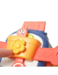 - - Na tylnej ścianie zabawki znajduje się doniczka z zajączkiem. Dzięki wystającej z dołu doniczki części, dziecko może poruszać króliczkiem. Dodatkowo po bogach doniczki wystają dwa końce paska, których przeciąganie powoduje kręcenie się kwiatka