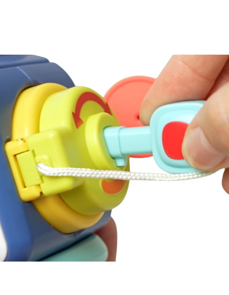 - - Na prawej ściance zabawki, umieszczony jest tajemniczy obrazek, który dziecko może zobaczyć w momencie przekręcenia klucza. Dla bezpieczeństwa najmłodszych kluczyk jest solidnie przeczepiony do zabawki na sznureczku.