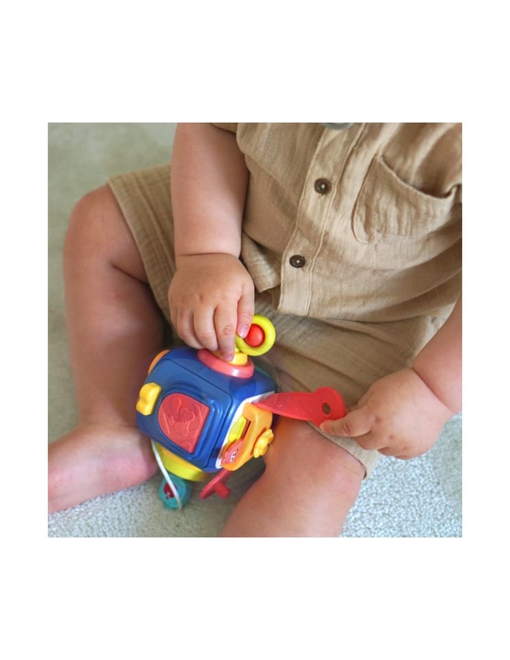 - Jasne i żywe kolory kostki wraz z różnymi kształtami, teksturami i dźwiękami zapewniają stymulację sensoryczną i zachęcają do rozwoju umiejętności motorycznych i koordynacji ręka-oko