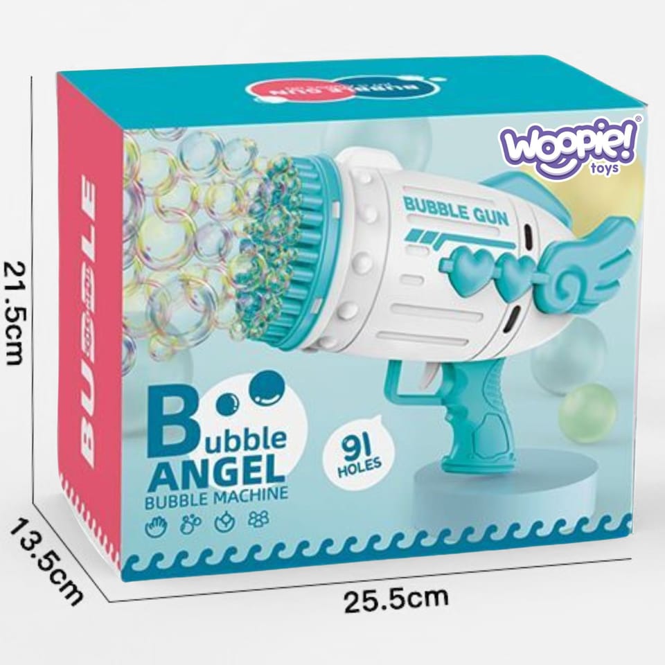 Maszyna do robienia baniek w kształcie pistoletu marki WOOPIE to świetna zabawka dla dzieci. Wypuszczone bąbelki wystrzeliwane są z dużą częstotliwością dzięki 91 otworom. Bańki mydlane to ulubiona zabawa małych i dużych dzieci. Pistolet do baniek mydlanych jest idealnym prezentem ponieważ jest łatwy w użyciu i zapewnia dużo radości- za jednym naciśnięciem spustu z pistoletu wylatuje mnóstwo baniek. Dodatkowo w zestawie znajdziemy 2 pojemniczki z płynem na bańki. Zabawka idealnie sprawdzi się podczas zabawy na dworze oraz w domu. Aby puszczać bańki mydlane wystarczy po zamontowaniu akumulatora zamoczyć pistolet w płynie znajdującym się na podstawce, nacisnąć na spust pistoletu i już! W jednej chwili mamy piękny, bajkowy świat, którym zachwycą się zarówno dzieci jak i dorośli.