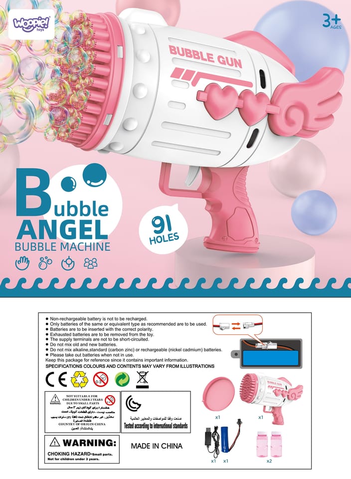 Maszyna do robienia baniek w kształcie pistoletu marki WOOPIE to świetna zabawka dla dzieci. Wypuszczone bąbelki wystrzeliwane są z dużą częstotliwością dzięki 91 otworom. Bańki mydlane to ulubiona zabawa małych i dużych dzieci. Pistolet do baniek mydlanych jest idealnym prezentem ponieważ jest łatwy w użyciu i zapewnia dużo radości- za jednym naciśnięciem spustu z pistoletu wylatuje mnóstwo baniek. Dodatkowo w zestawie znajdziemy 2 pojemniczki z płynem na bańki. Zabawka idealnie sprawdzi się podczas zabawy na dworze oraz w domu. Aby puszczać bańki mydlane wystarczy po zamontowaniu akumulatora zamoczyć pistolet w płynie znajdującym się na podstawce, nacisnąć na spust pistoletu i już! W jednej chwili mamy piękny, bajkowy świat, którym zachwycą się zarówno dzieci jak i dorośli.