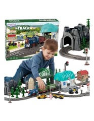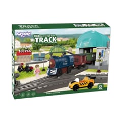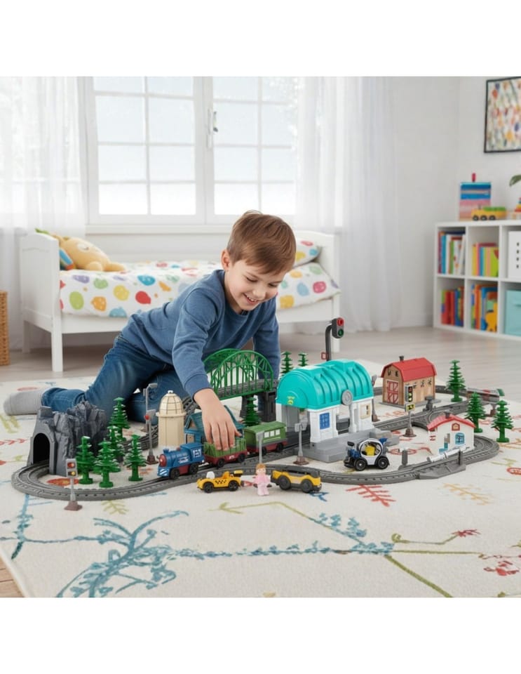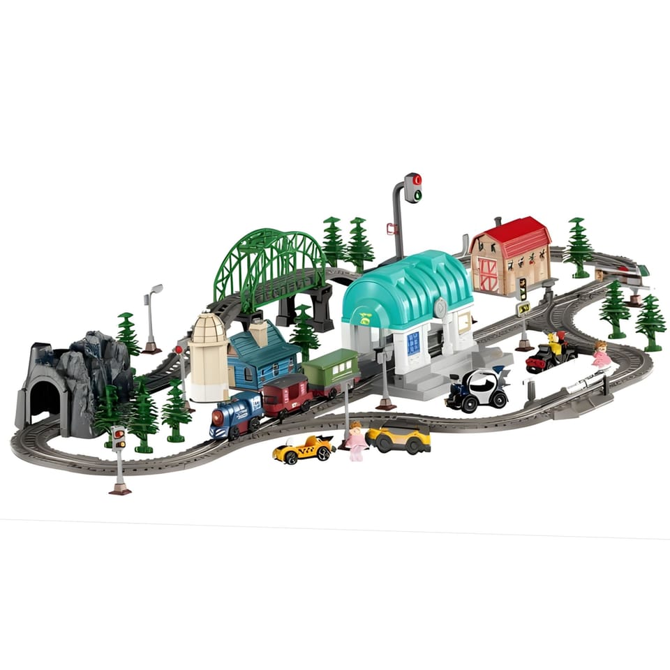 - - 108 elementów w zestawie – w tym tory, most, tunel, stacja, pojazdy i figurki