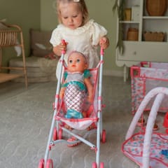 - - Wózek-parasolka – lekki, składany, w różowej kolorystyce z motywem syrenim.