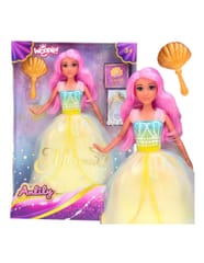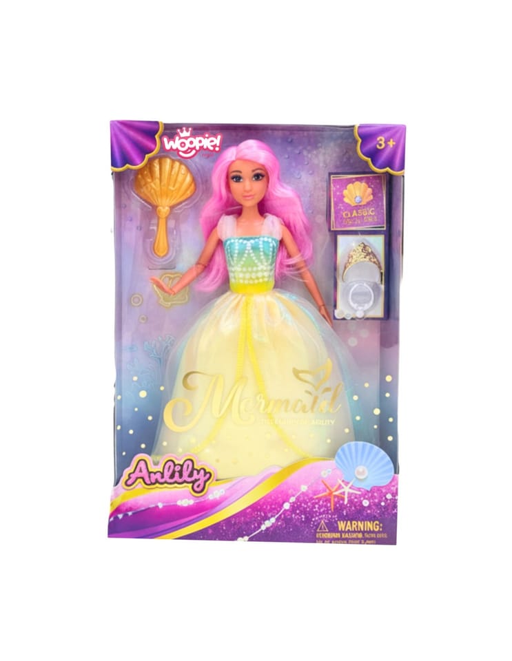Poznaj uroczą Księżniczkę Lily od marki Woopie– lalkę inspirowaną podwodnym światem syrenek. Jej długie, różowe włosy zachęcają do czesania i tworzenia fantazyjnych fryzur. Błyszcząca, pastelowa suknia w odcieniach morskiej piany sprawia, że wygląda jak prawdziwa księżniczka z oceanu. W zestawie znajduje się złoty grzebień w kształcie muszli oraz elegancki pierścionek, które dopełniają stylizacje. To doskonały prezent dla dzieci od 3 lat, który rozwija wyobraźnię i pozwala tworzyć niezliczone, bajkowe historie.
