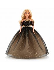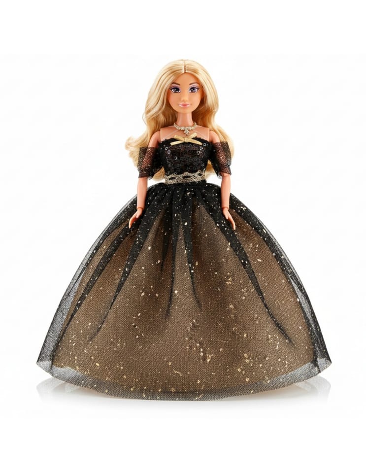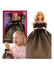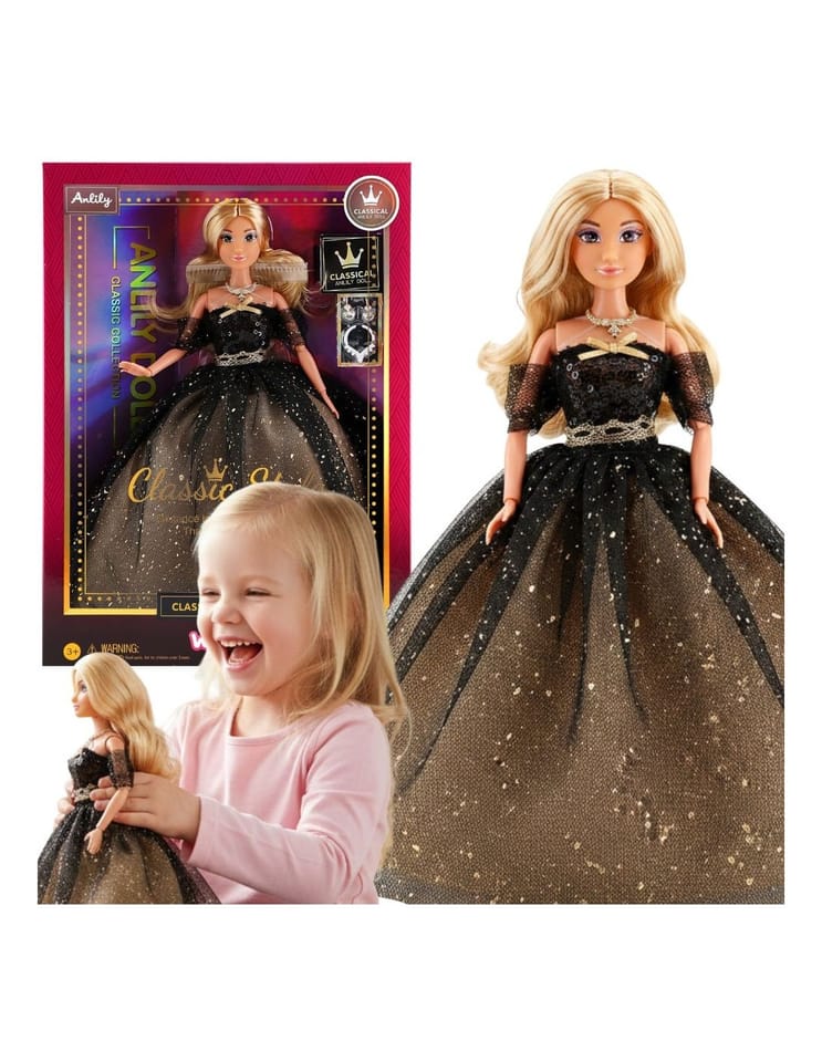 - - Lalka z długimi włosami w czarno-złotej eleganckiej sukni