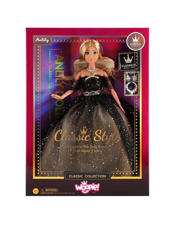 Lalka Lily marki Woopie to prawdziwa ikona stylu i elegancji! Zachwyca spektakularną wieczorową kreacją w odcieniach czerni i złota, ozdobioną tysiącami cekinów. Długie, złote włosy są idealne do tworzenia najpiękniejszych fryzur. Ta wyjątkowa lalka to inspiracja do zabawy w świat mody i eleganckich przyjęć.